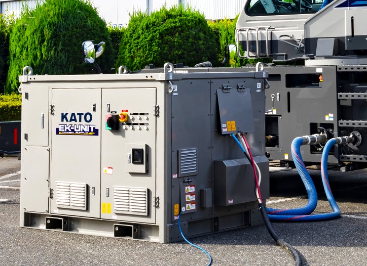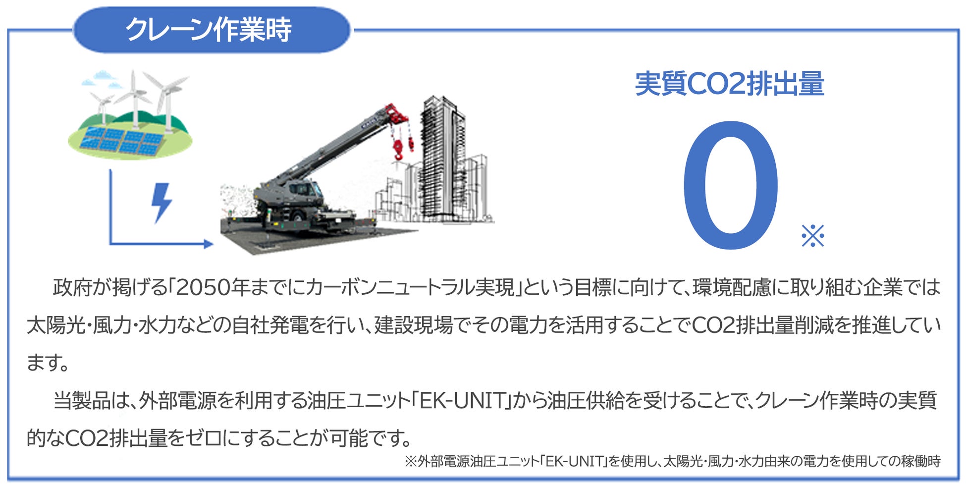 当製品は外部電源油圧ユニット「EK-UNIT」を標準付属品としています。これにより、電源確保が可能な建設現場では、電力のみでクレーン作業を行うことが可能です。