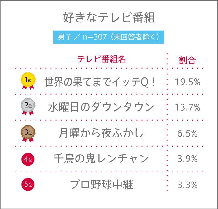 男女共通の1位は、日本テレビ系列で放送中の『世界の果てまでイッテQ!』。現在の高校3年生が生まれた2007年に放送が開始された番組で、長く愛されている番組であることがわかりました。