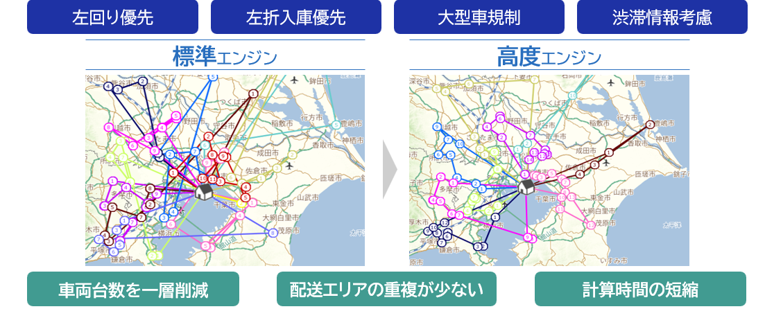 左回り優先、左折入庫優先、大型規制や渋滞情報などを踏まえた配車の提示を行う高度エンジンをオプションで提供します。
