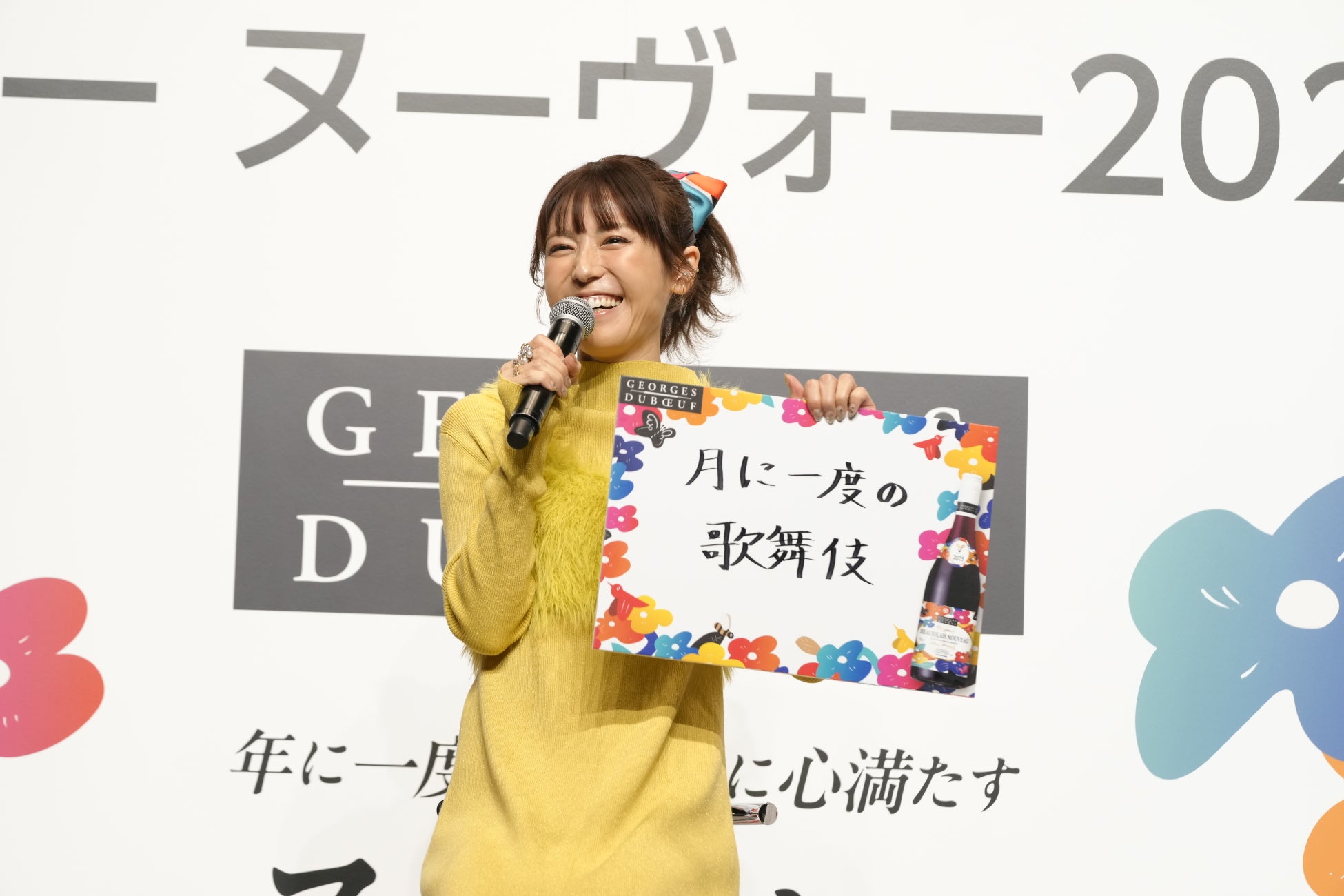 続いて、タレントの若槻千夏さんが登壇。ラベルのデザインをあしらったスカーフを髪飾りにし、ラベルパッケージにあわせた華やかな黄色い衣装を披露しました。
