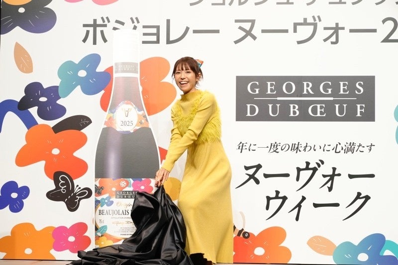 その後、「ボジョレー ヌーヴォー 2025」の巨大ワインボトルパネルをアンベールし、花柄のラベルをまとったボトルのデザインを公開。12年ぶりに復活したアートラベルは、ボジョレーのぶどう畑の生物多様性をモチーフにデザインされています。自身でファッションブランドもプロデュースする若槻さんはラベルに対し「プレゼントラッピングされているようなデザインで素敵です!週末のパーティの手土産にもぴったりですね」とコメントしました。