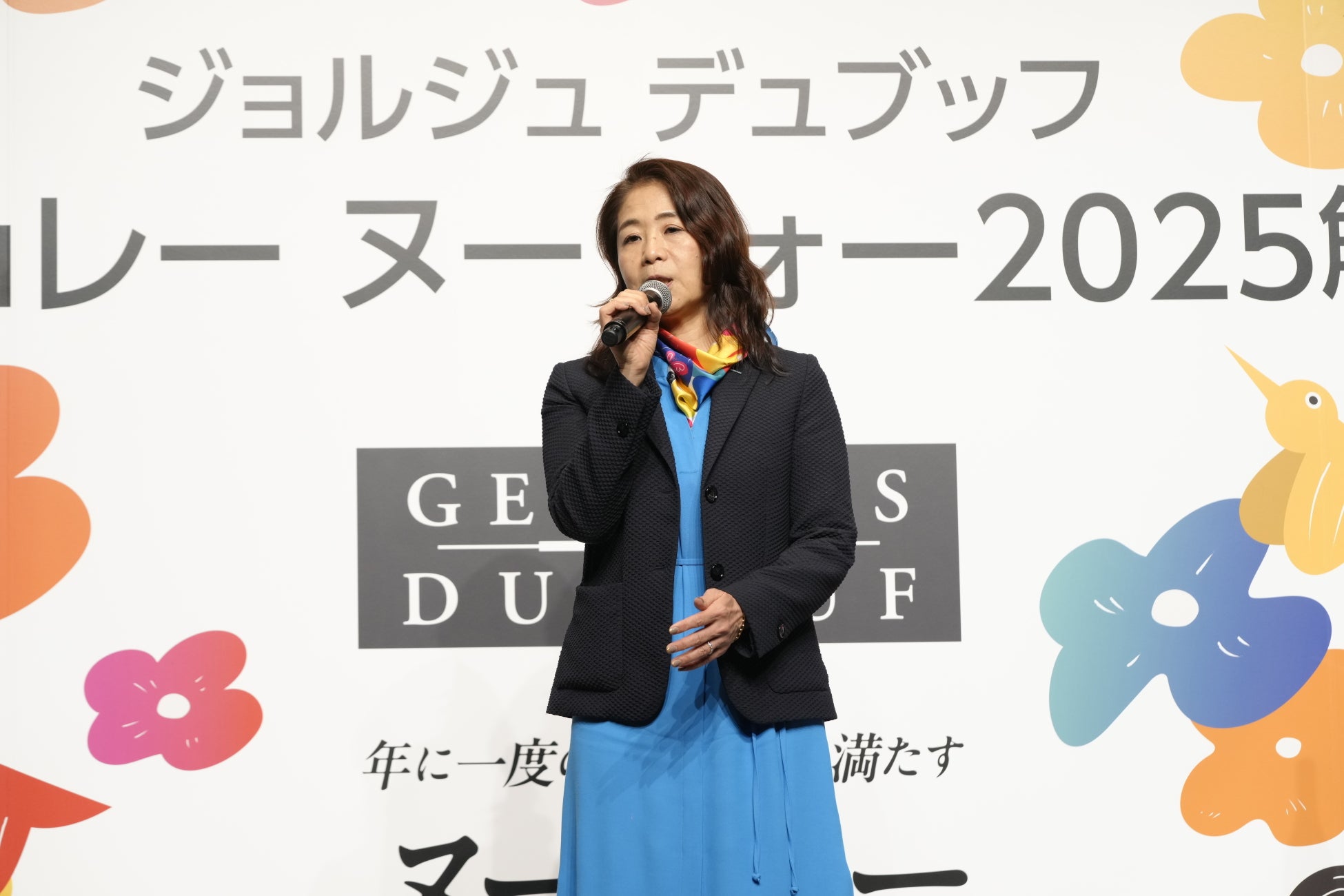 はじめに、サントリー株式会社 常務執行役員 ワイン本部長 吉雄敬子が登壇し、今年のボジョレー ヌーヴォーの味わいについて説明しました。「今年のボジョレー地区は記録的な猛暑で、雨も非常に少ない年でした。雨が少ない暑い年にはぶどうがぎゅっと凝縮されるため、今年のワインは果実味がしっかりしていて豊かで、さらにヌーヴォーのため渋みがないという素晴らしいワインに仕上がりました」と話し、続けて「今年は通常の赤をはじめ、ロゼやオレンジといった5種類のボジョレー ヌーヴォーを用意しております。中でも、色々な種類を気軽に楽しんでいただけるハーフボトルに力を入れております」と語りました。
