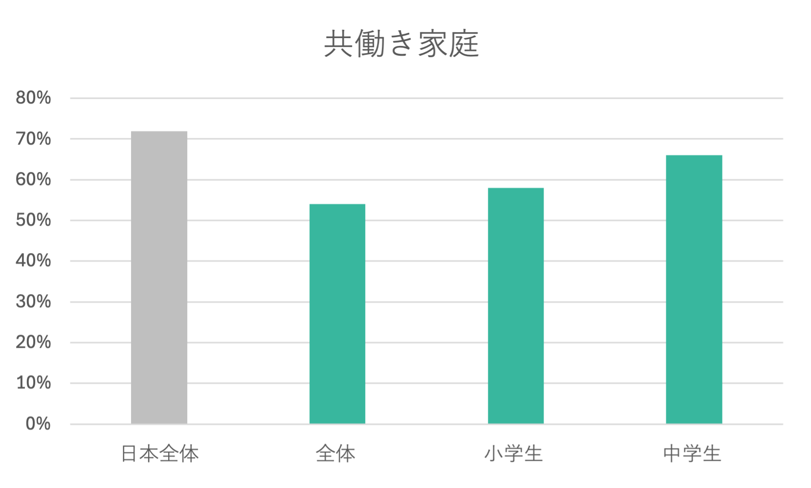 共働き家庭の割合は、54%でした。これは、日本全体の共働き家庭の割合約7割を下回ります(詳細4)。