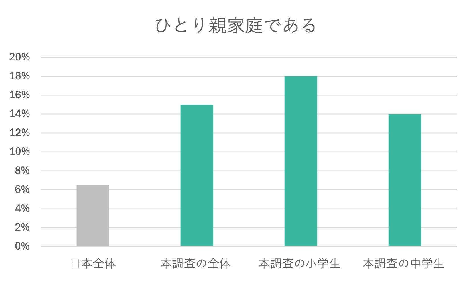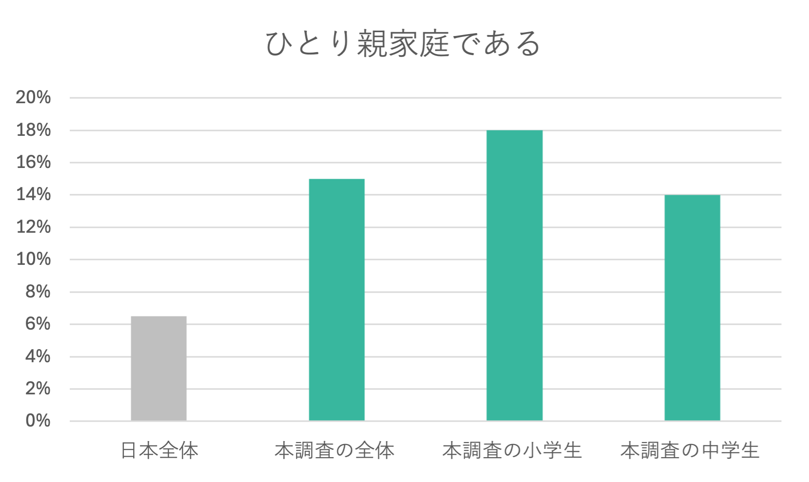 ひとり親家庭の割合は15%でした。これは、日本全体のひとり親家庭の割合約6.5%を上回ります(詳細2)。