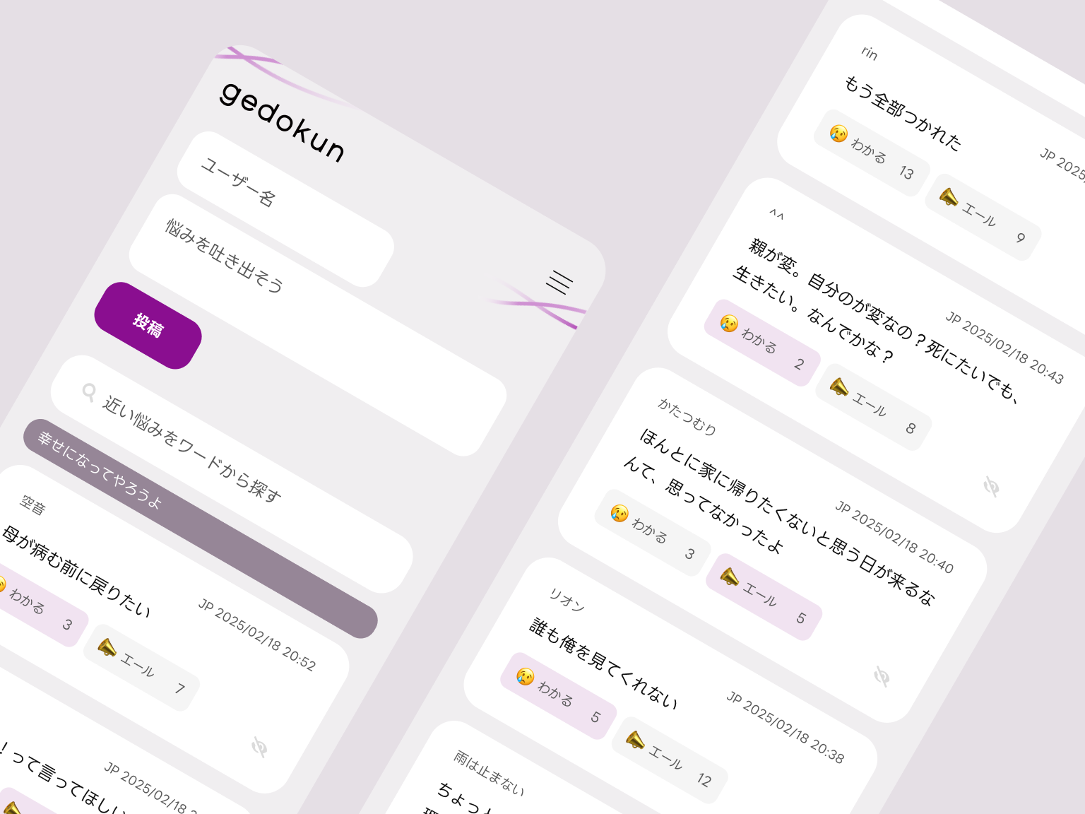 投稿には、共感や励ましのリアクションを送ることができ、投稿内容の文脈判定から同法人が運営する情報サイトnigerunoへの誘導を行っている。