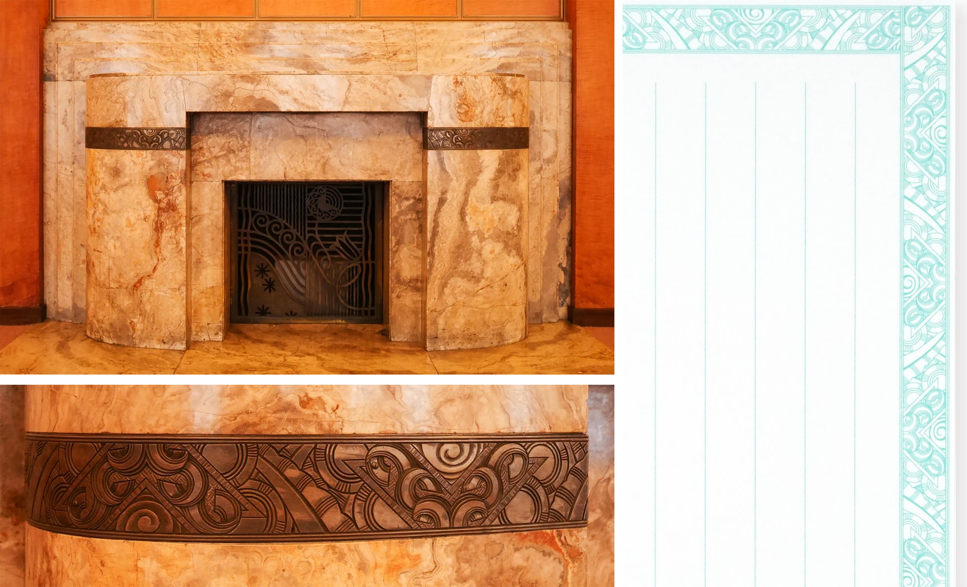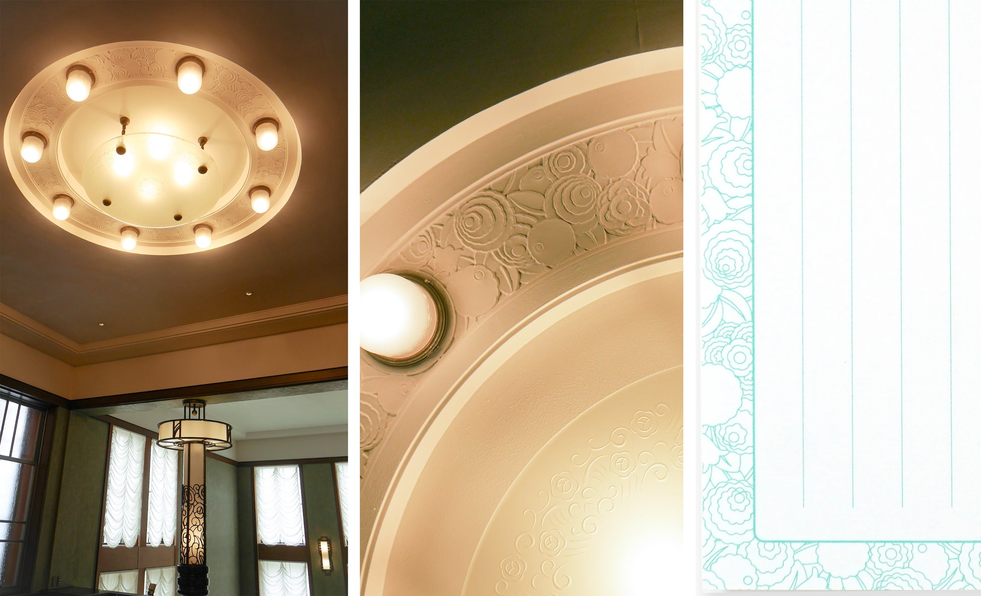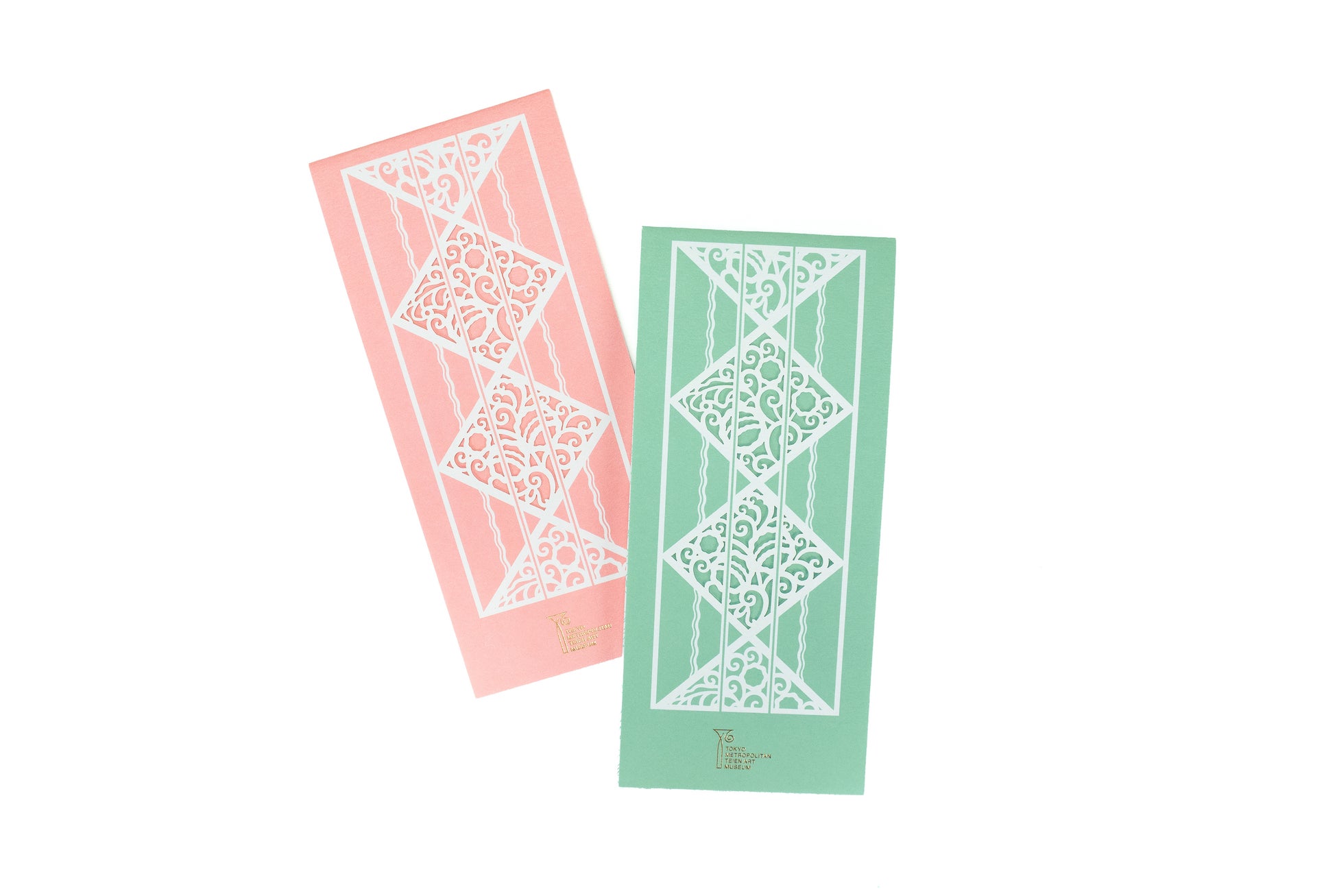 一筆箋の中紙の文様は2種。大客室マントルピース装飾とニ階広間の照明の装飾を使用しました。こちらもあまりメインで紹介される機会が少ない部分ですが、館内のこだわった装飾を知るきっかけになればと考えました。また、紙質は東京都庭園美術館のイメージに合うよう、白く厚みのある紙を採用しています。