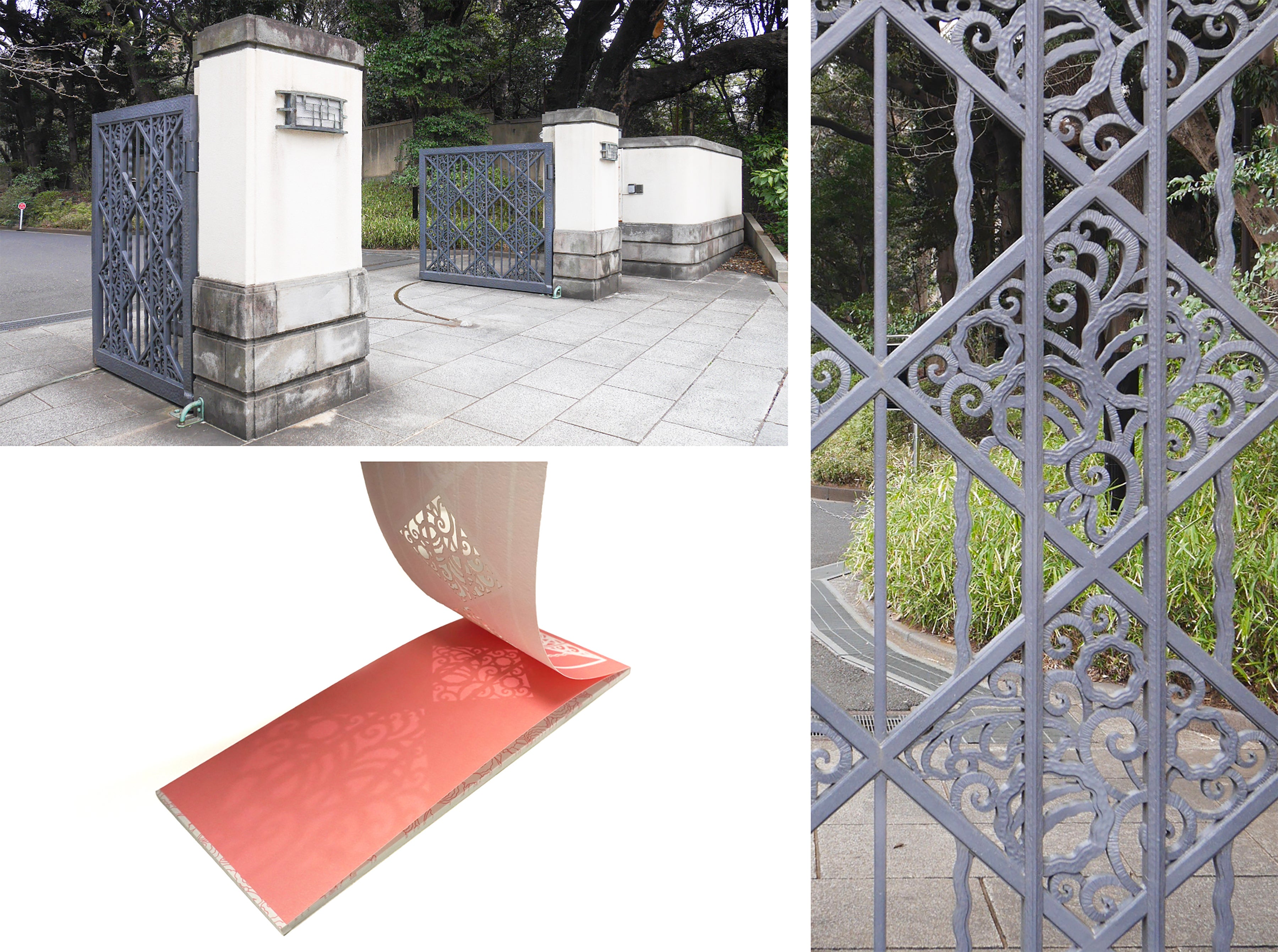 旧朝香宮邸は敷地内の建造物の複数が重要文化財に登録されています。その中でも訪れた人が最初に目にする重要文化財建造物である正門の意匠を表紙に使用した一筆箋です。つい意識せずに通り過ぎてしまいがちな正門ですが、門扉にはオリジナルの意匠を使用しており、繊細な細工で表現されています。グッズを通して、普段注視しない部分にも目を向けてほしいと思い、表紙に採用しました。表紙は正門意匠の形にレーザーカット加工を施し、光に透かすと影が落ち、その美しい文様が浮き上がるよう工夫しています。