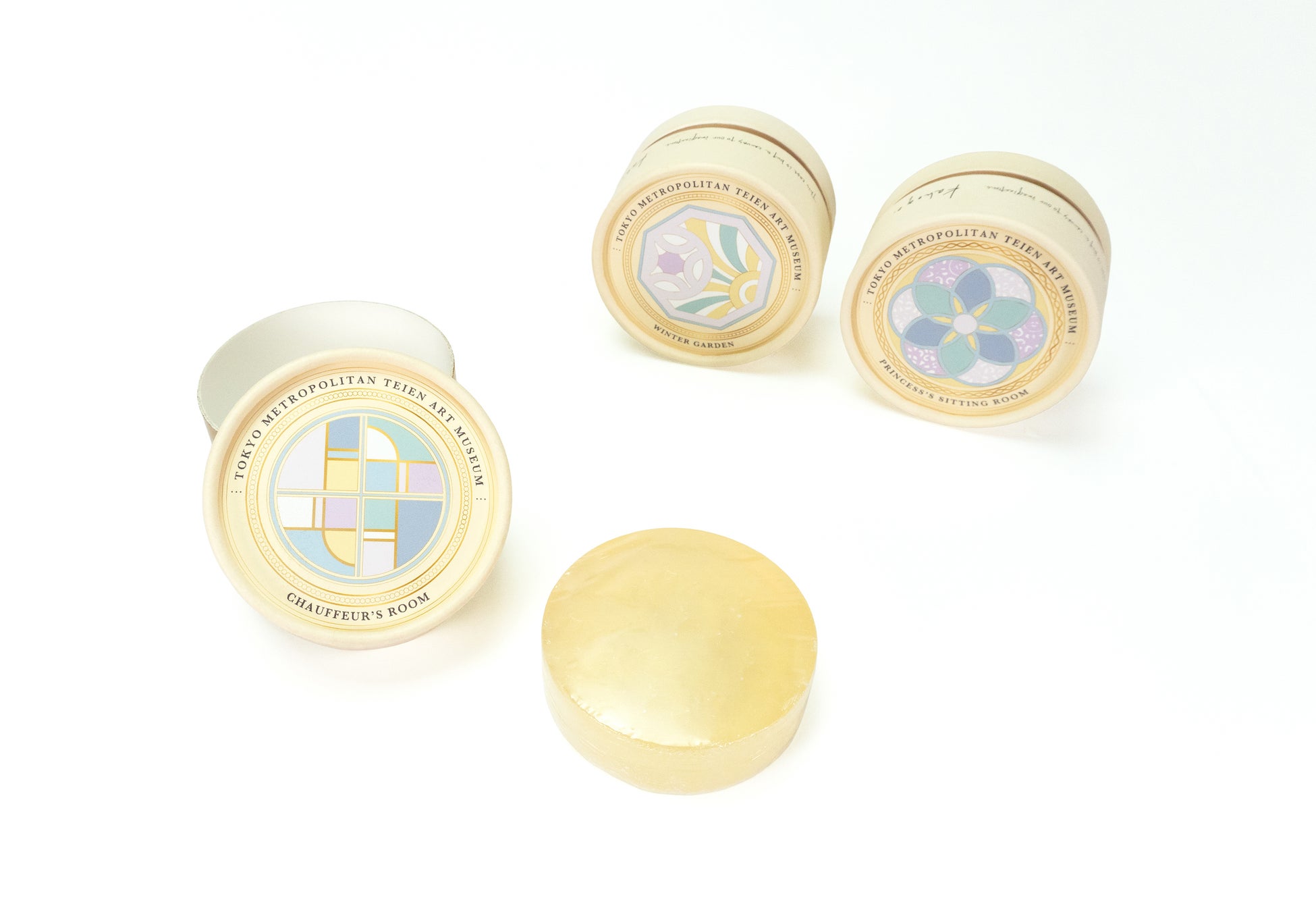 自然乾燥と手磨きを90日間繰り返して作られた枠練り石鹸「kahogo soap(カホゴソープ)」の東京都庭園美術館限定デザイン箱です。丸い箱の形状を生かし、家丁・運転手室窓、ウインターガーデン金物装飾、姫宮居間照明まわりの邸内意匠をあしらいました。