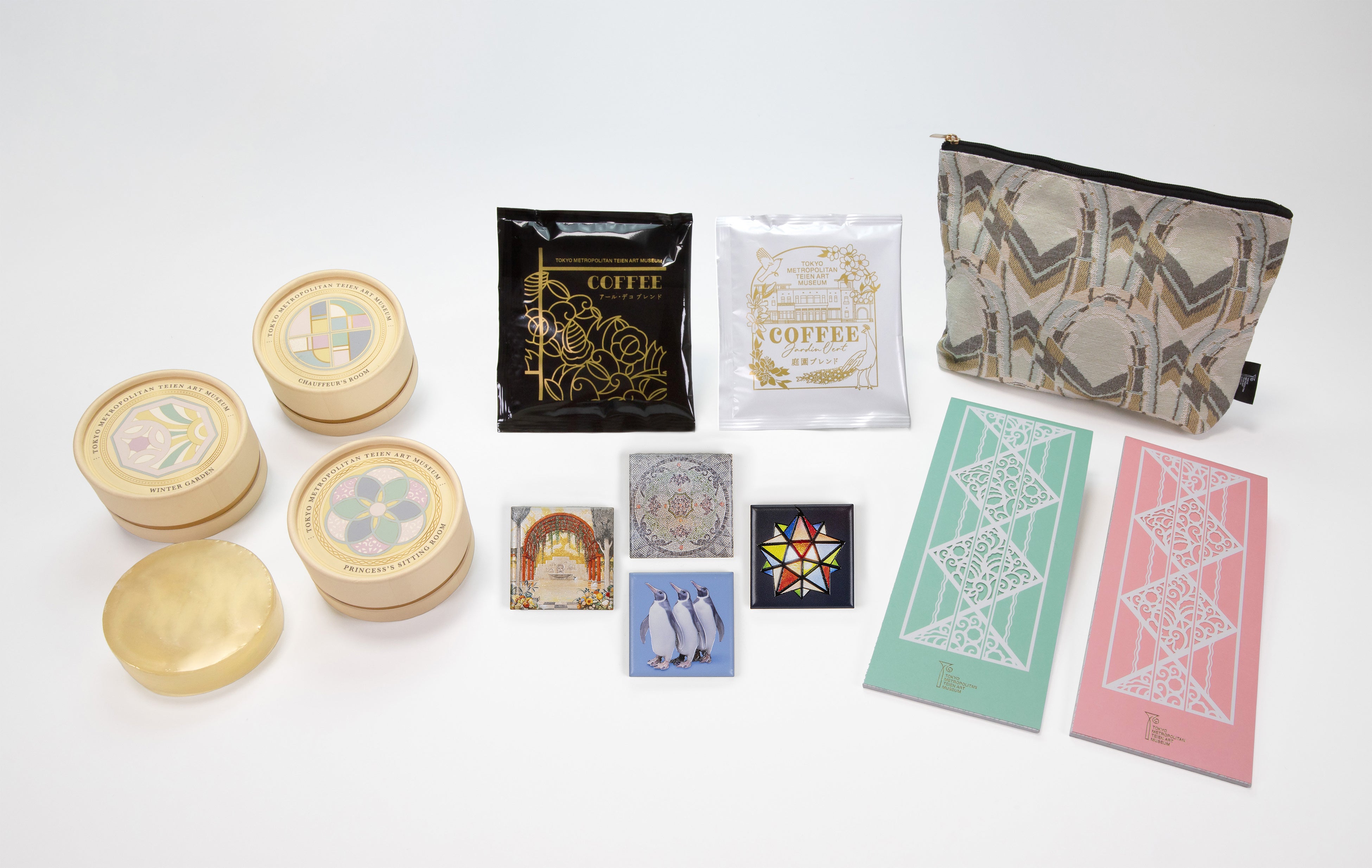 これに際して、株式会社オークコーポレーション(本社:東京都渋谷区、代表:新牧章代)が運営する東京都庭園美術館ミュージアムショップでは、館内の建築意匠や展示品をモチーフにした一筆箋、ポーチ、アートマグネット、珈琲の4種を新たに発売します。