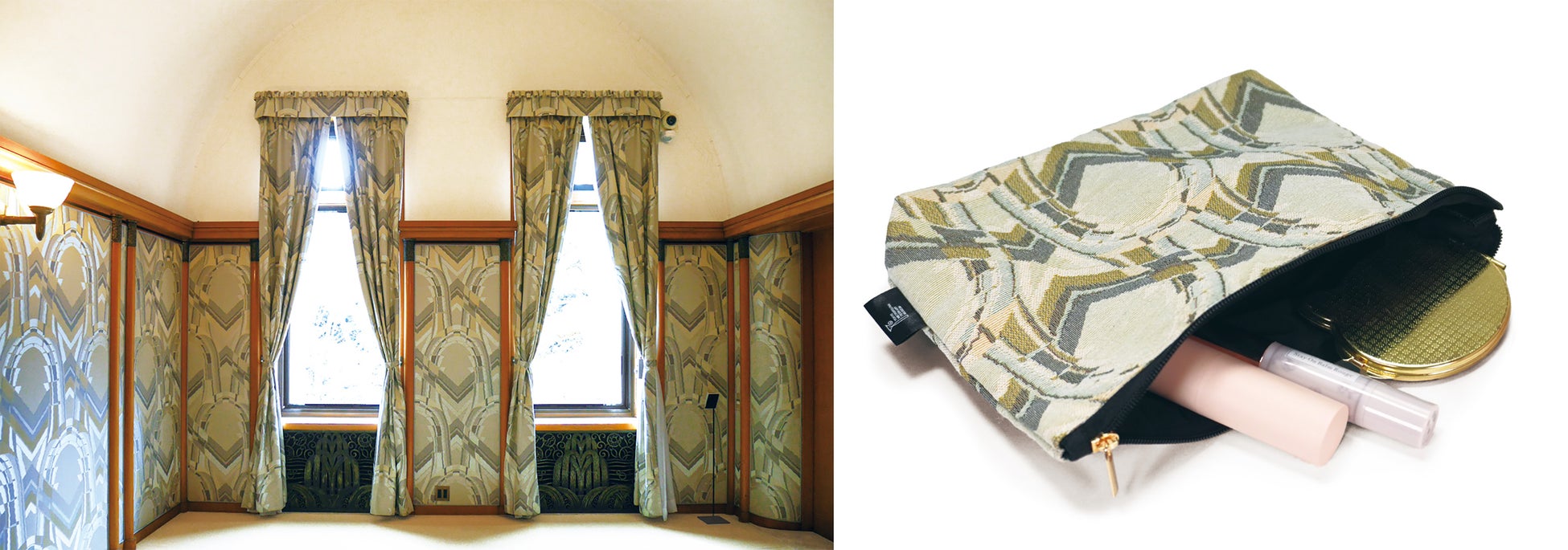 その壁布のデザインを緻密なジャガード織で表現したポーチです。邸内意匠を、日常的に持ち歩けるアイテムにしました。