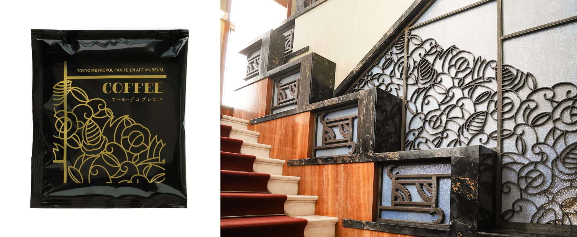 アール・デコの旧朝香宮邸をイメージした「アール・デコ ブレンド」は、エクアドル産、イエメン産、コスタリカ産、エルサルバドル産の4種の豆を中煎りしており、コクと酸味のバランスが綺麗な余韻を残す、印象的な味わいです。以前より販売していましたが、今回はパッケージの色を変更して装い新たに再登場します。パッケージデザインは、第一階段の鉄製装飾です。