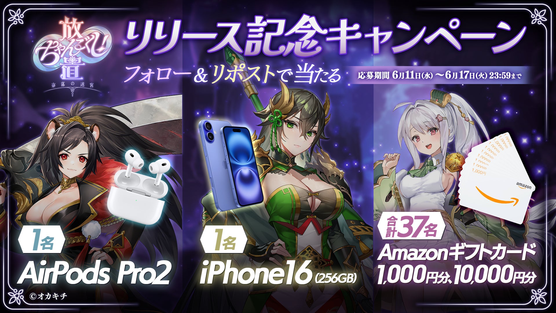 公式X(旧Twitter)では、iPhone 16やAirPods Pro、最大1万円分のAmazonギフトコードなど、豪華賞品が総勢55名様に当たる「リリース記念プレゼントキャンペーン」を開催中です。
