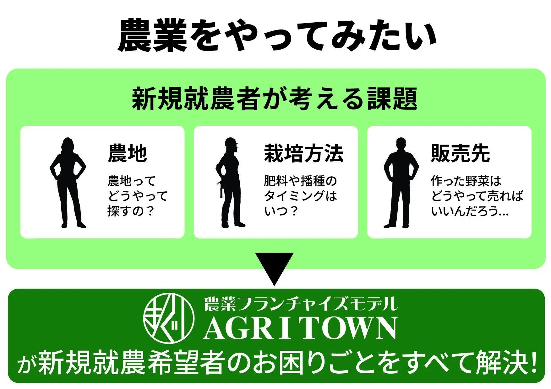 アグリタウンとは、農業への新規参入の課題を解決する農業のフランチャイズモデルです。