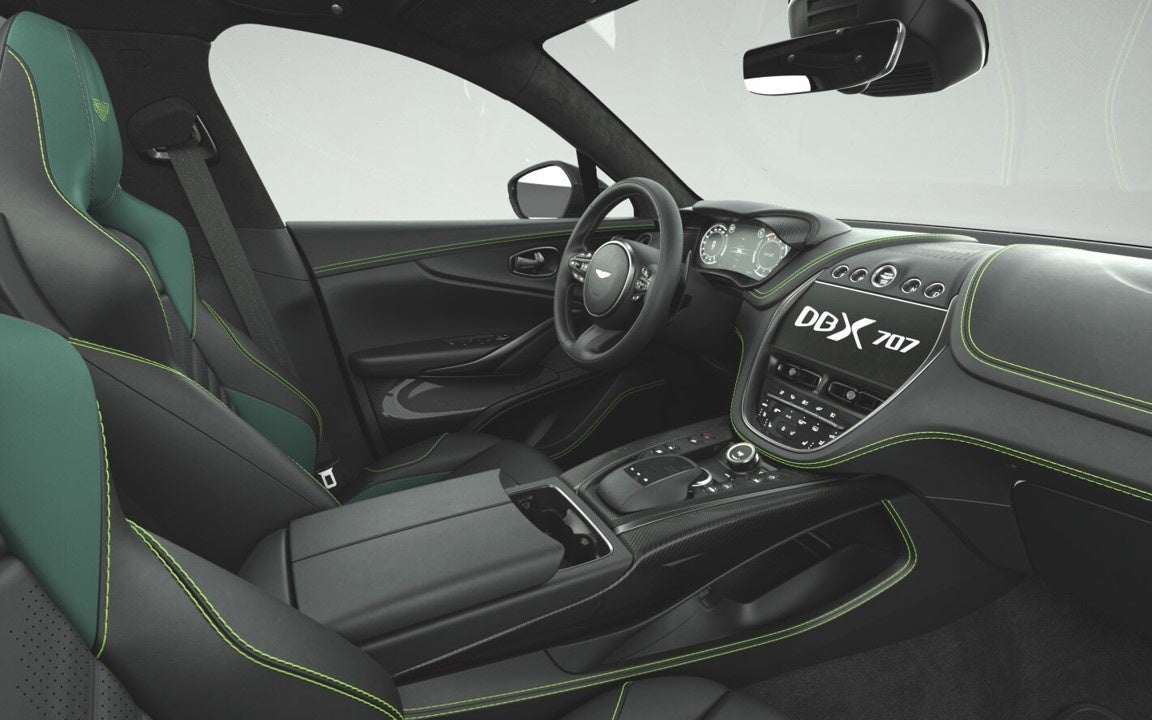 DBX707 Midnight Podium Editionのインテリアは、オニキスブラック/アイフェルグリーンレザーが、ダークサテンカーボンファイバージュエリーとカーボンファイバーベニアを備えたインスパイア・スポーツ・デュオトーンインテリアを飾り、エクステリアデザインと呼応するライムグリーンのステッチがコントラストを引き立てます。また、この限定モデルには「Q by Aston Martin」のシル・プレートが取り付けられ、この記念すべきエディションのエクスクルーシブさが強調されています。