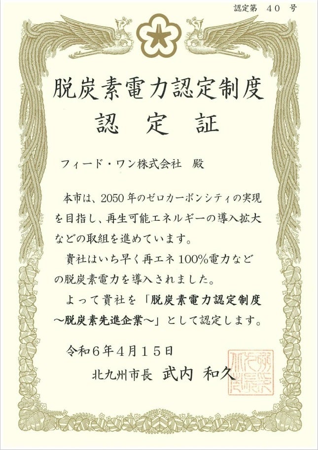 フィード・ワンは、この北九州市の取り組みに賛同するとともに、他の地域においても積極的に気候変動対策を推進・実施していくことで、事業活動を通じた持続可能な社会の実現に今後とも貢献してまいります。