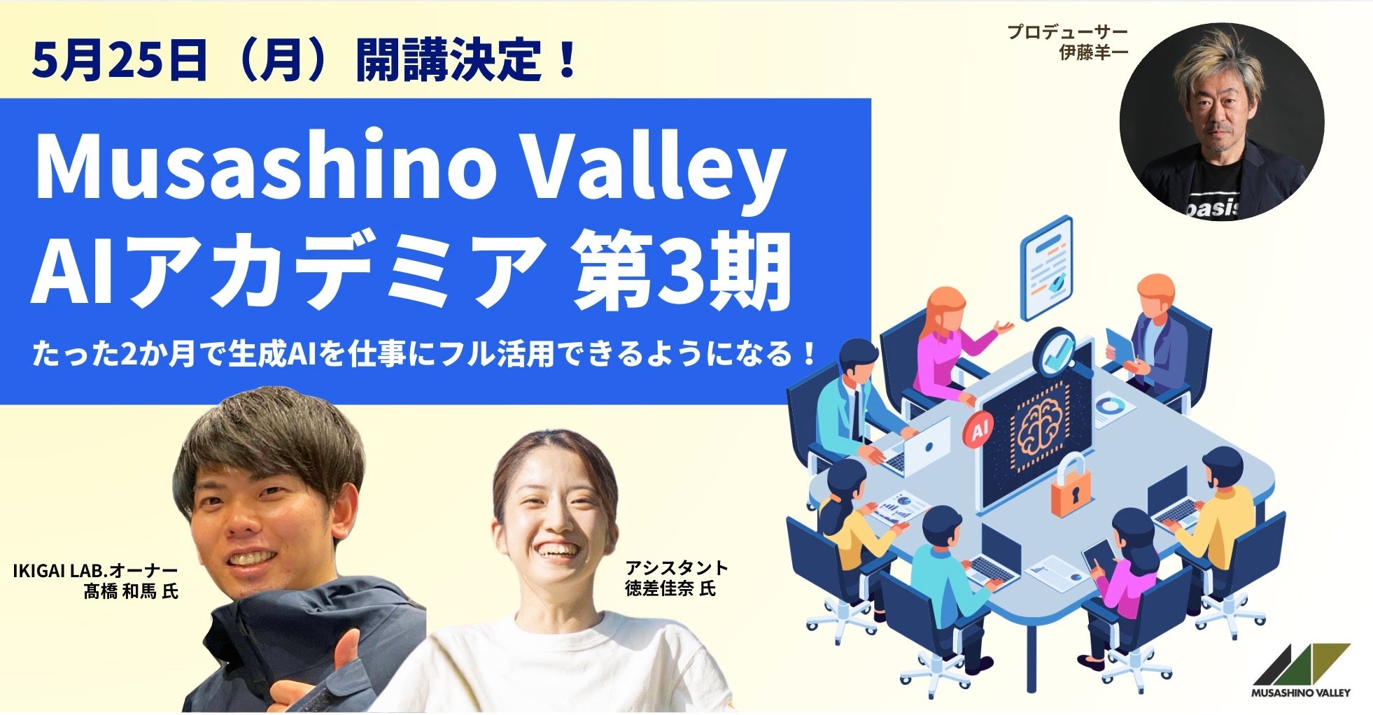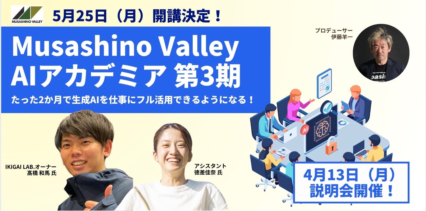 「次のステップ」に踏み出すすべての人を応援するスタートアップスタジオ「Musashino Valley」を運営する株式会社Musashino Valley(本社:東京都大田区、代表取締役CEO 伊藤 羊一、以下Musashino Valley)は、IKIGAI lab.オーナー 髙橋 和馬氏を講師に迎え、「Musashino Valley AIアカデミア 第3期」を2026年5月25日(月)より開講します。