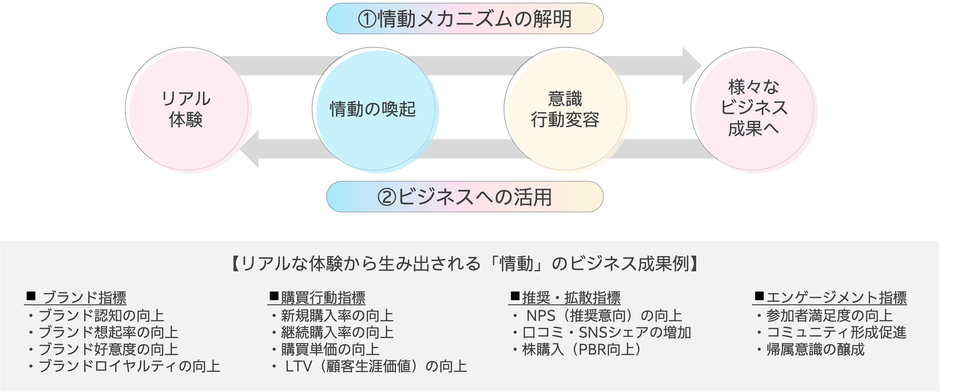 体験で人の気持ちが強く動く「情動」のメカニズムに科学的・学術的にアプローチし、体験→情動の喚起→行動変容→ビジネス成果という一連の仕組みをモデル化し、リアル体験の価値を新たなビジネス開発に活用する。