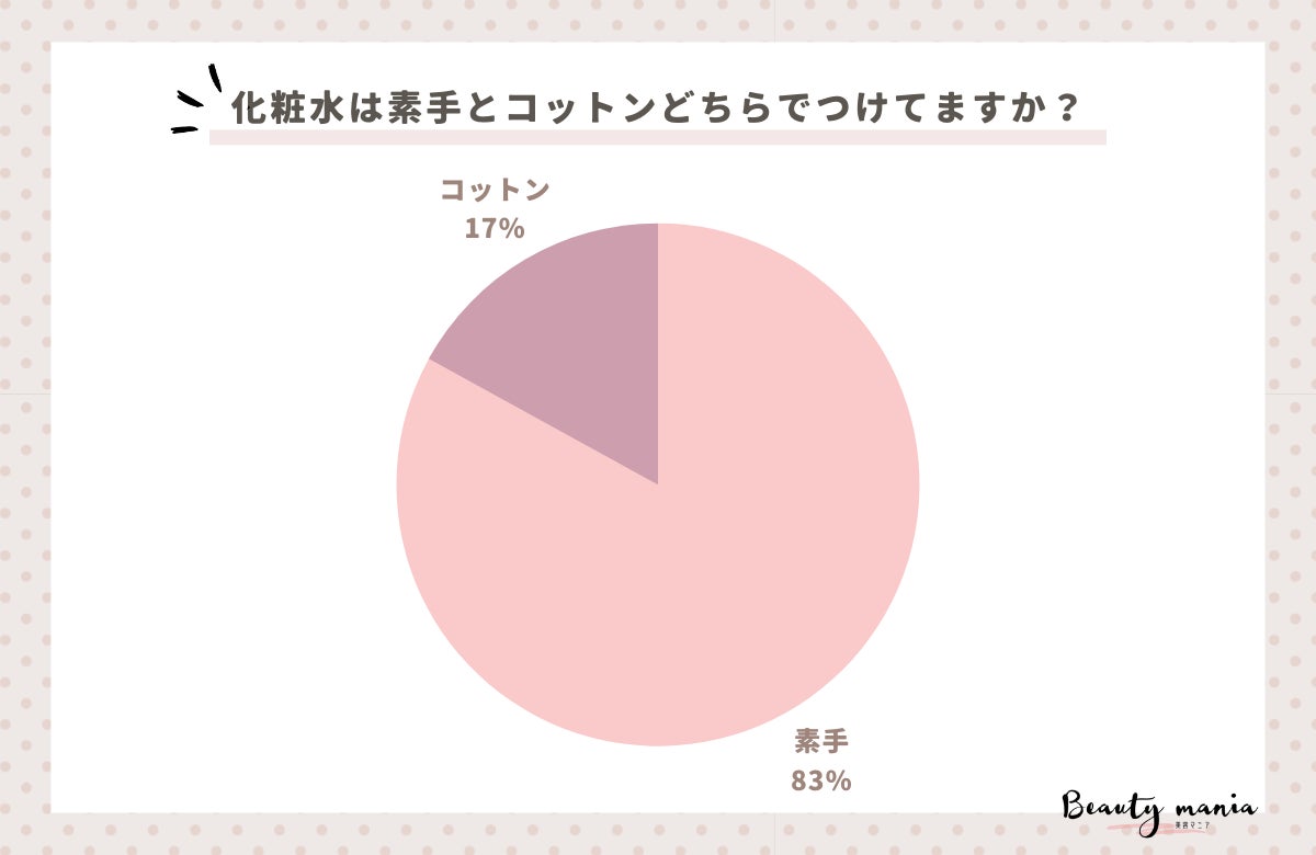 「化粧水は素手とコットンどちらでつけてますか?」とアンケート調査した結果、1位は『素手(83人)』、2位は『コットン(17人)』となっています。