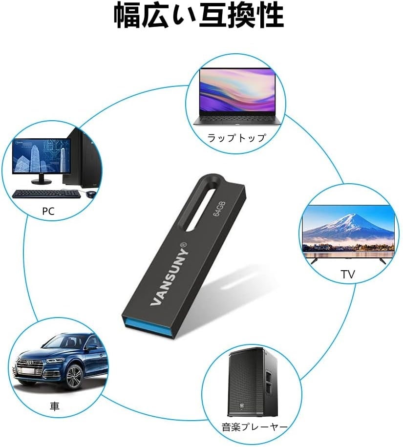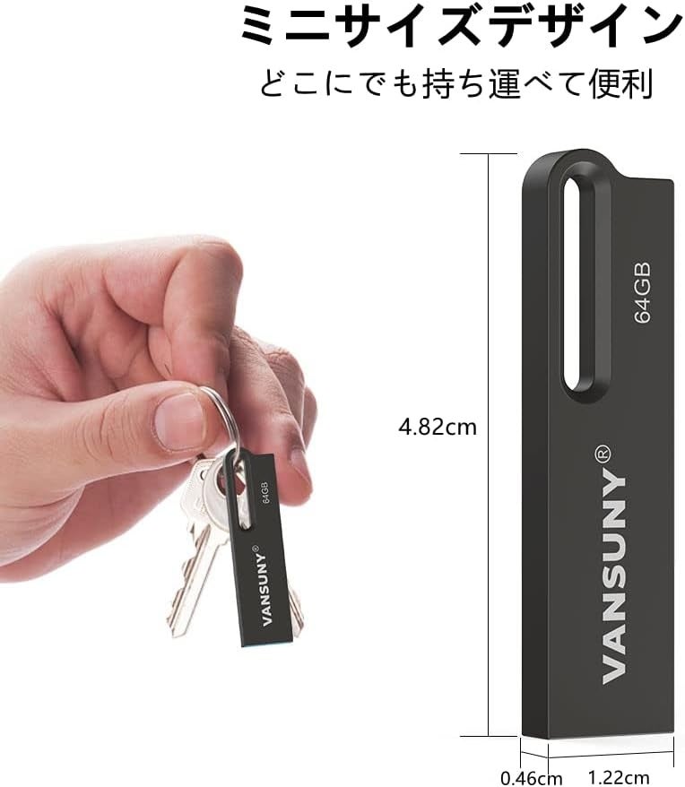 このVANSUNY社の64GB USB 3.0 金属防水USBメモリは、優れた性能を誇るストレージデバイスです。大容量のデータ保存スペースと高速なデータ転送速度を備えており、さまざまなファイルの保存や転送がスムーズに行えます。さらに、金属製の防水設計を採用しており、耐久性と信頼性があり、データの安全性を様々な環境下で確保します。