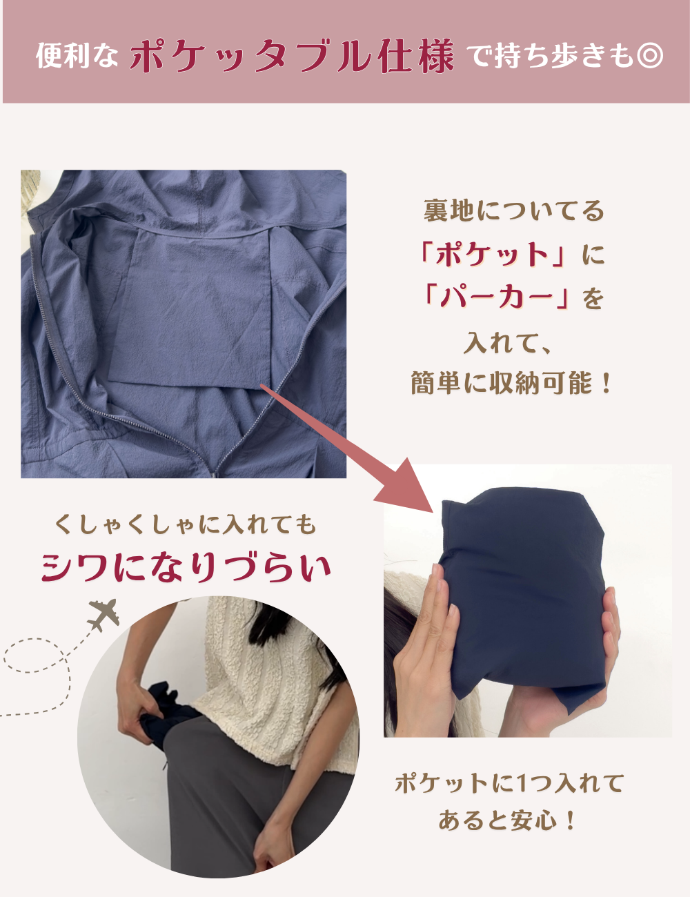 裏地のポケットに本体を収納できる、ポケッタブル仕様です。