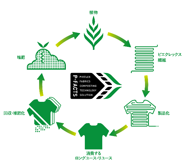 「P-FACTS」(PIECLEX FAbrics Composting Technology Solution)は、ピエクレックス社が主導し、植物由来のポリ乳酸を原料とした素材である「電気の繊維」ピエクレックスを使用したアパレル製品や繊維製品を回収し、林業や農業での利活用を目的とする堆肥化までを、パートナー企業、自治体、福祉施設、学校法人等、多くのステークホルダーと連携・共創し構築した、透明性高い循環インフラです。