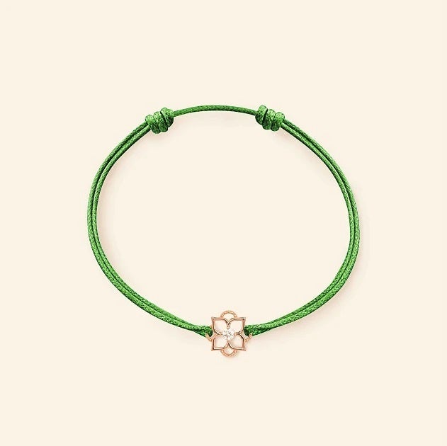 18Kピンクゴールドのモチーフに、0.06ctのダイヤモンドをあしらったコードブレスレット。深みのあるグリーンコードは、生命の躍動や自然の調和を象徴し、愛の成熟と深まりを表現します。自然の美しさと洗練されたジュエリーデザインが融合し、手元にそっと寄り添う一本です。