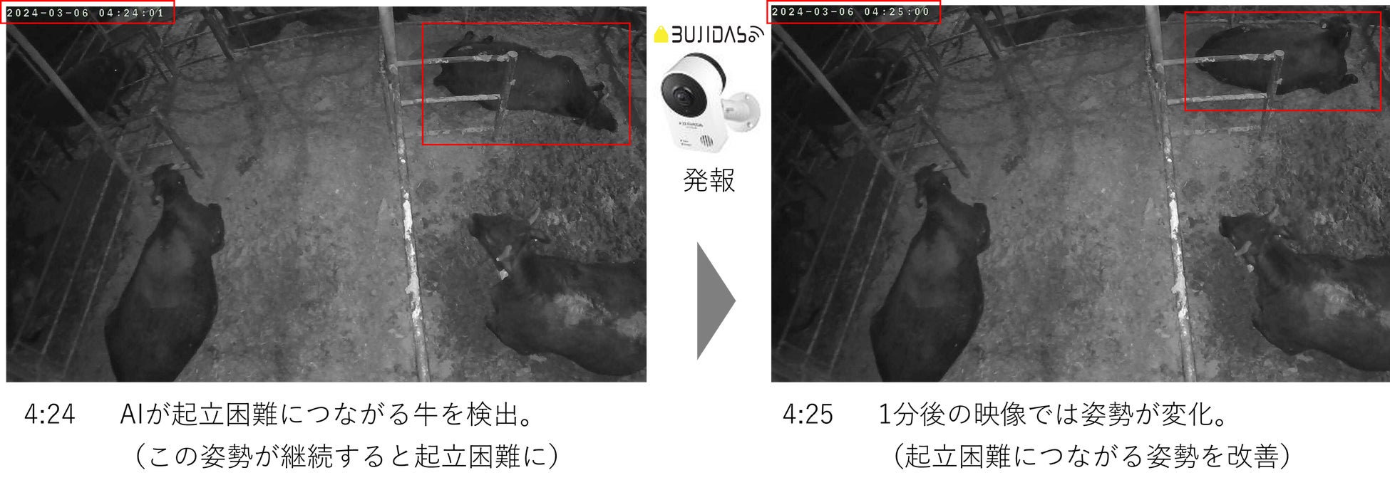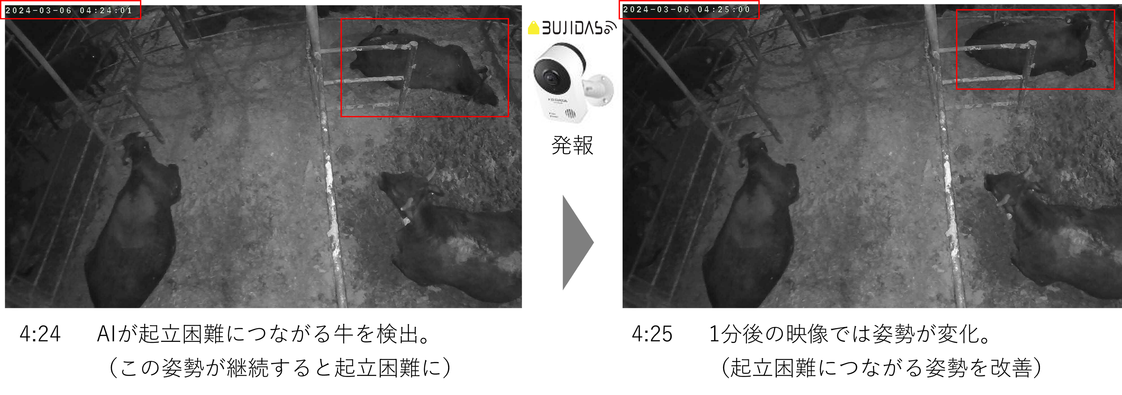 本サービスは、ネットワークカメラで撮影した牛の姿勢をAIが判定し、ネットワークカメラから発報される音によって牛の姿勢を変えさせることで、起立困難の発生を予防(*7)する非接触型の日本で初めてとなるサービスです(特許出願済)。