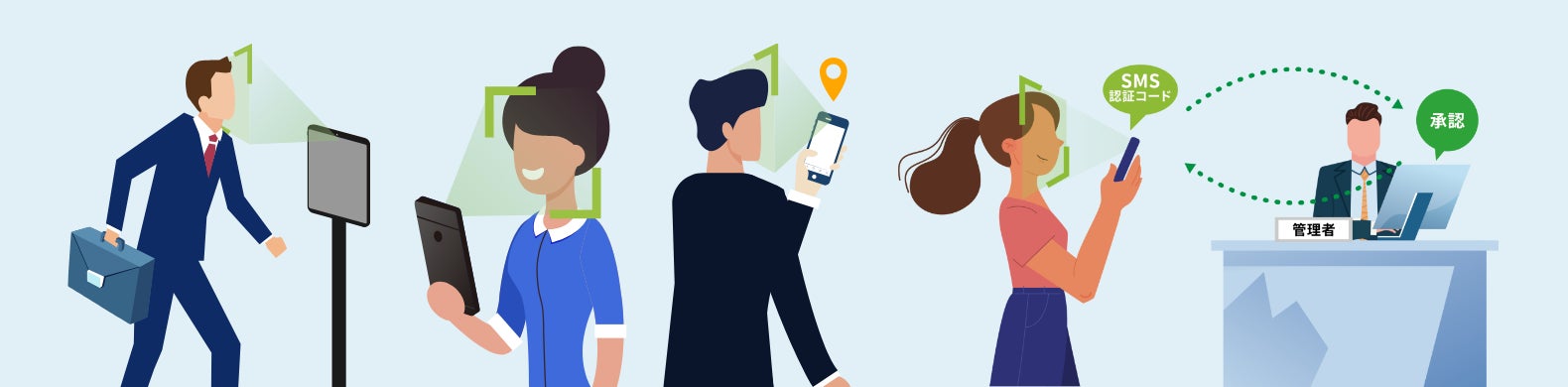 顔認証で打刻することで、なりすましや不正打刻を防ぎます。位置情報での認証制限も可能。2段階認証で強度セキュリティな認証も設定可能です。また、専用の機器も不要です。パソコンやタブレット、従業員のスマートフォンで簡単に打刻ができます。