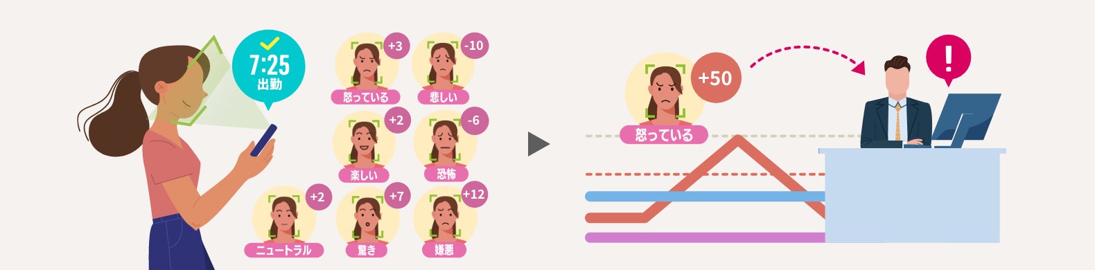 顔認証打刻時に感情を記録、日々の感情の推移をグラフで確認し、過剰な感情の変化が現れた場合には管理者にアラートを送信することができます。従業員のストレス度合いを早いうちに確認することで、事前にフォローアップを行うことが可能になり、離職率の低下に繋がります。