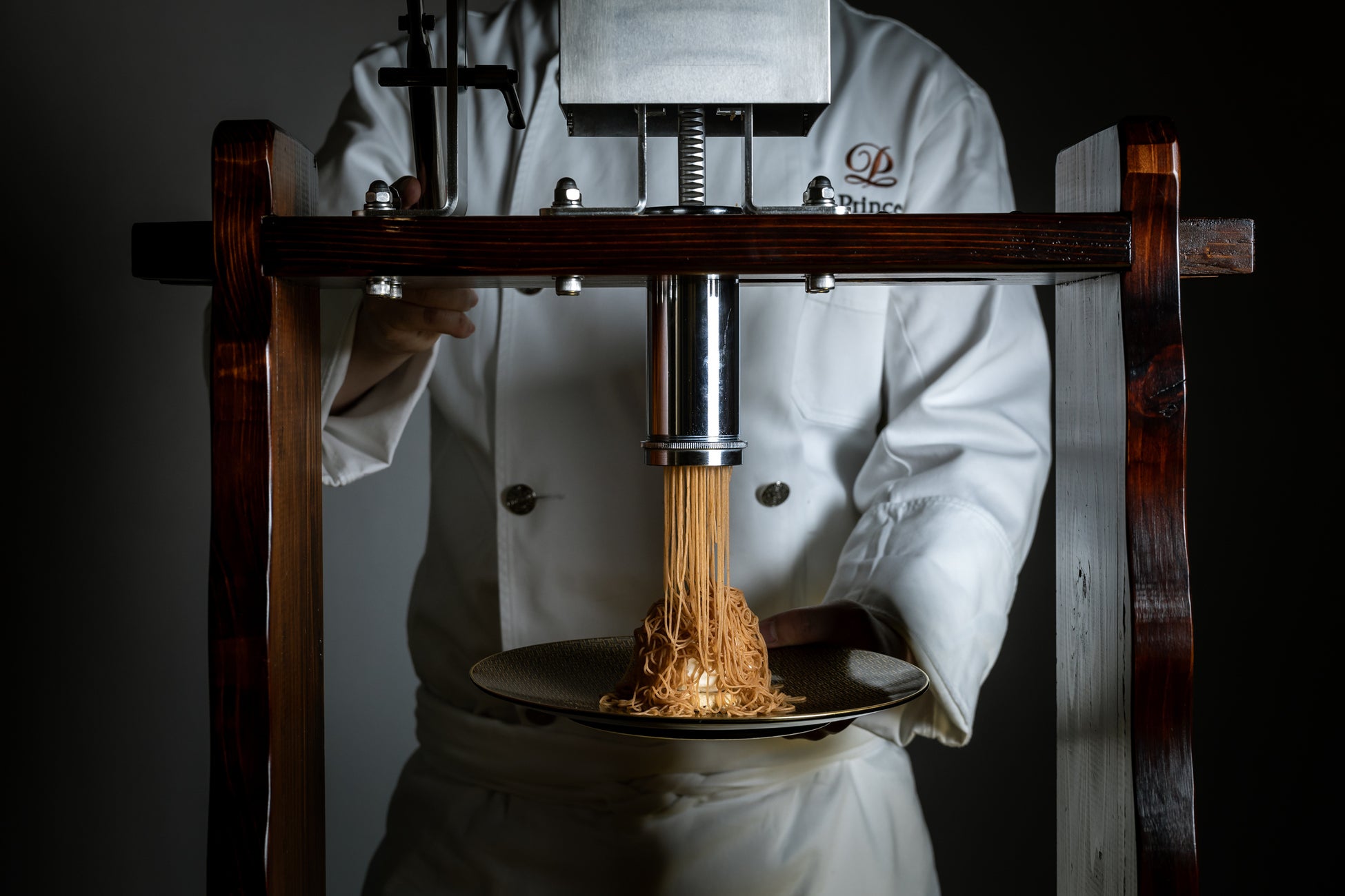 メインとなるグランドデザートは、プリンスホテル名誉総料理長 内藤武志が監修。ライブステーションにてお客さまの目の前でマロンクリームを搾り、金粉をあしらった「搾りたてモンブラン」をご提供いたします。ザクザク食感のヘーゼルナッツのメレンゲをベースに、中心に栗を丸ごと1粒、その周りをフワッと軽いさっぱり生クリームで囲い、仕上げに濃厚なフランス産の栗を使用したマロンクリームを纏わせた、食べ進めるごとに食感が楽しめる贅沢な逸品になっております。