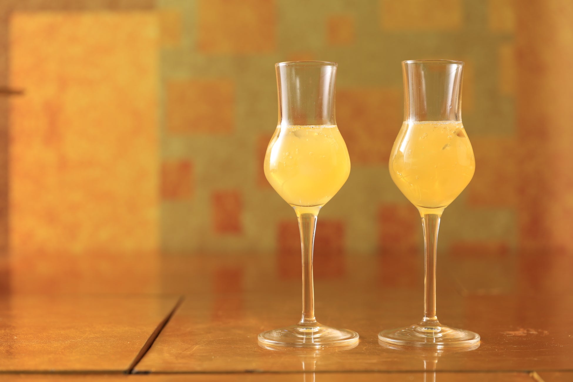 ゴールドカラーのマスカットゼリーを入れたグラスにノンアルコールのスパークリングワインを注いだノンアルコールカクテル
