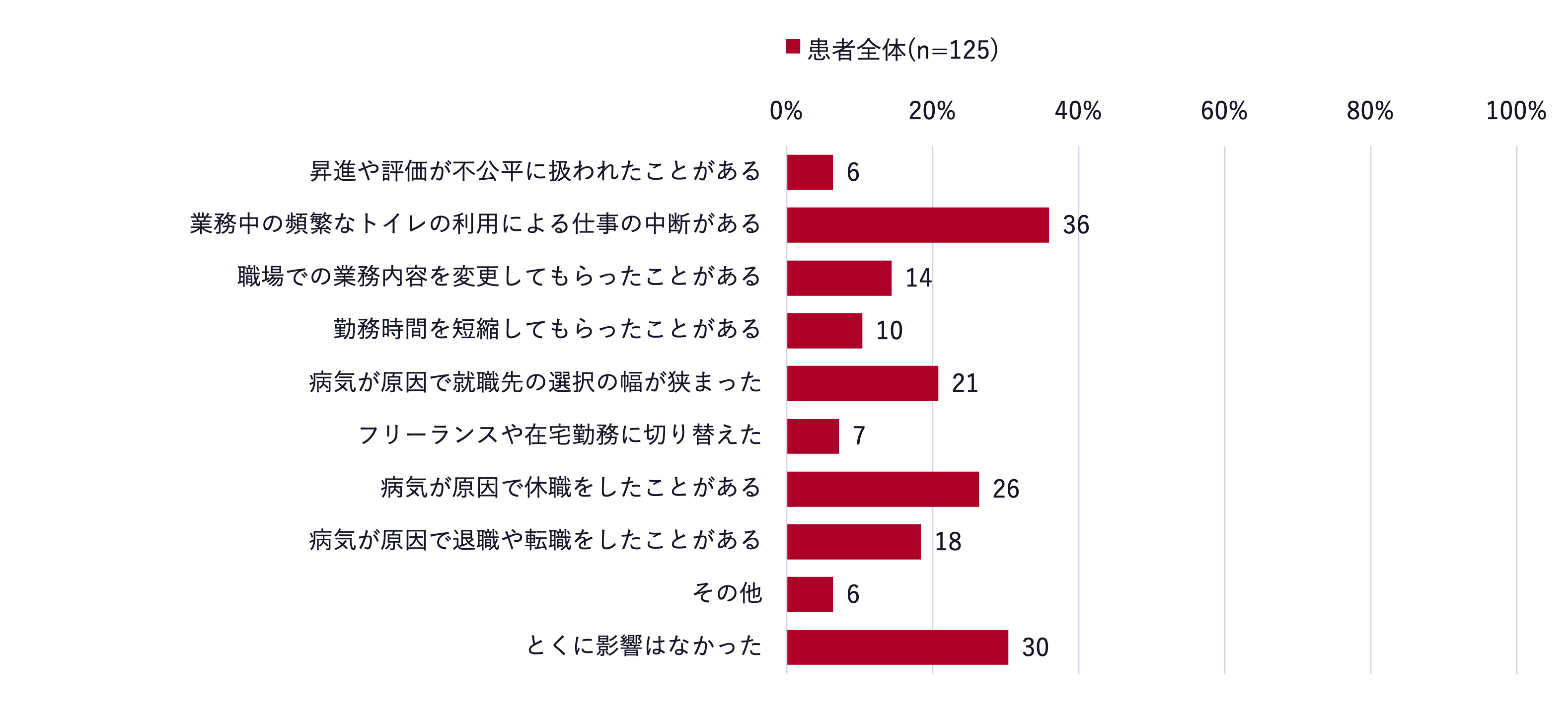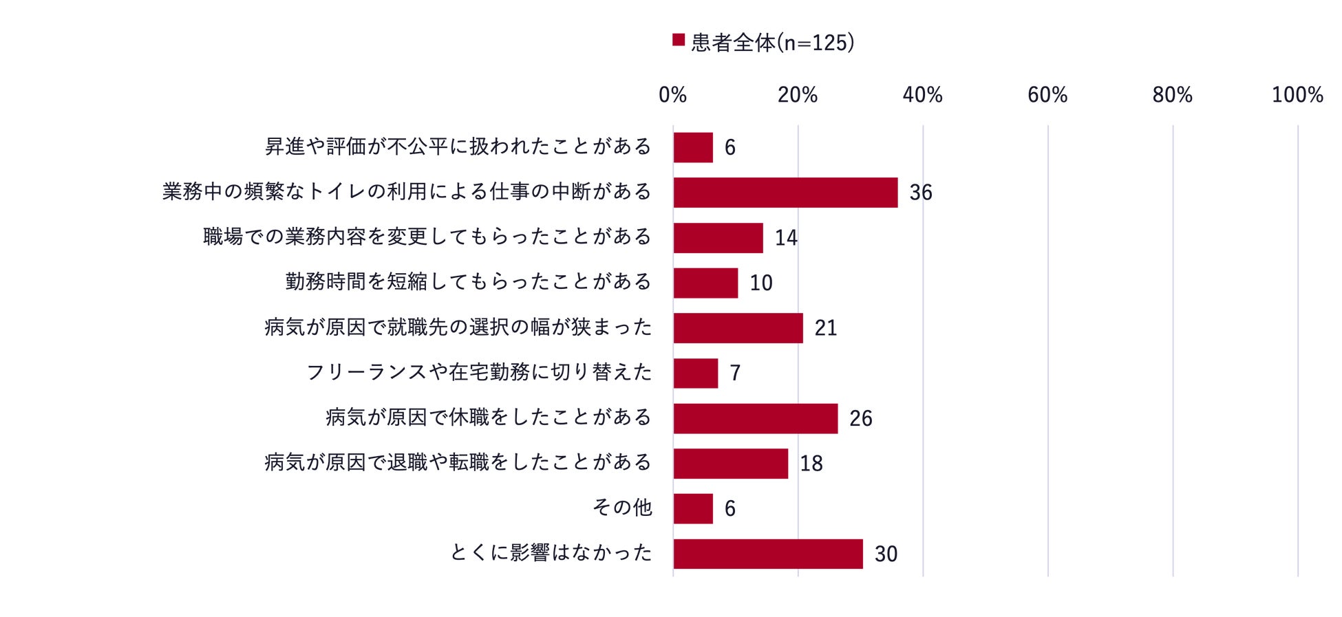 「業務中の頻繁なトイレ利用による仕事の中断がある」が最多(36.0%)、「病気が原因で休職したことがある」(26.4%)、「退職・転職したことがある」(18.4%)、「就職先の選択の幅が狭まった」(20.8%)と続いた。「職場での業務内容を変更してもらった」(14.4%)や「勤務時間を短縮してもらった」(10.4%)といった回答からは、職場での理解や具体的な働き方の調整が必要であることがうかがえる。