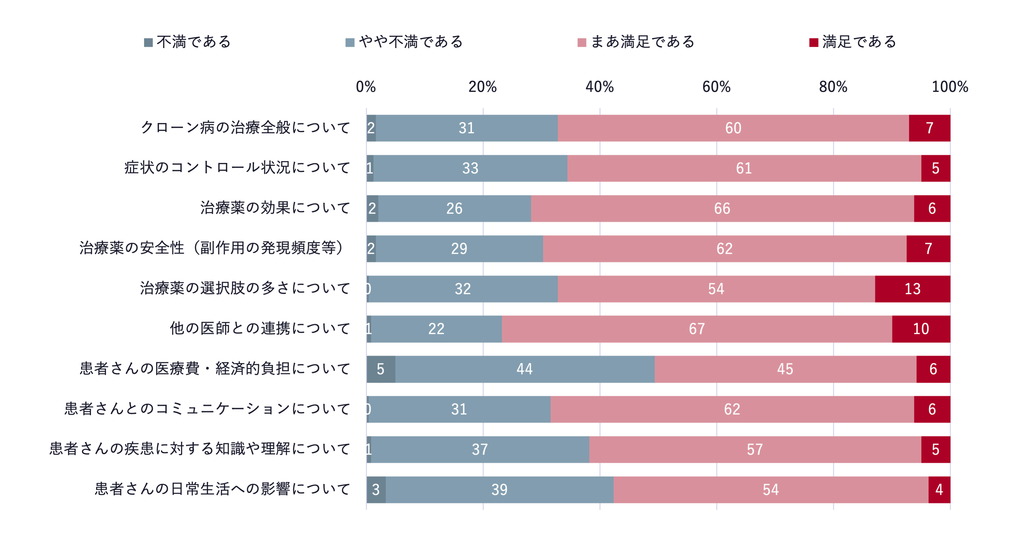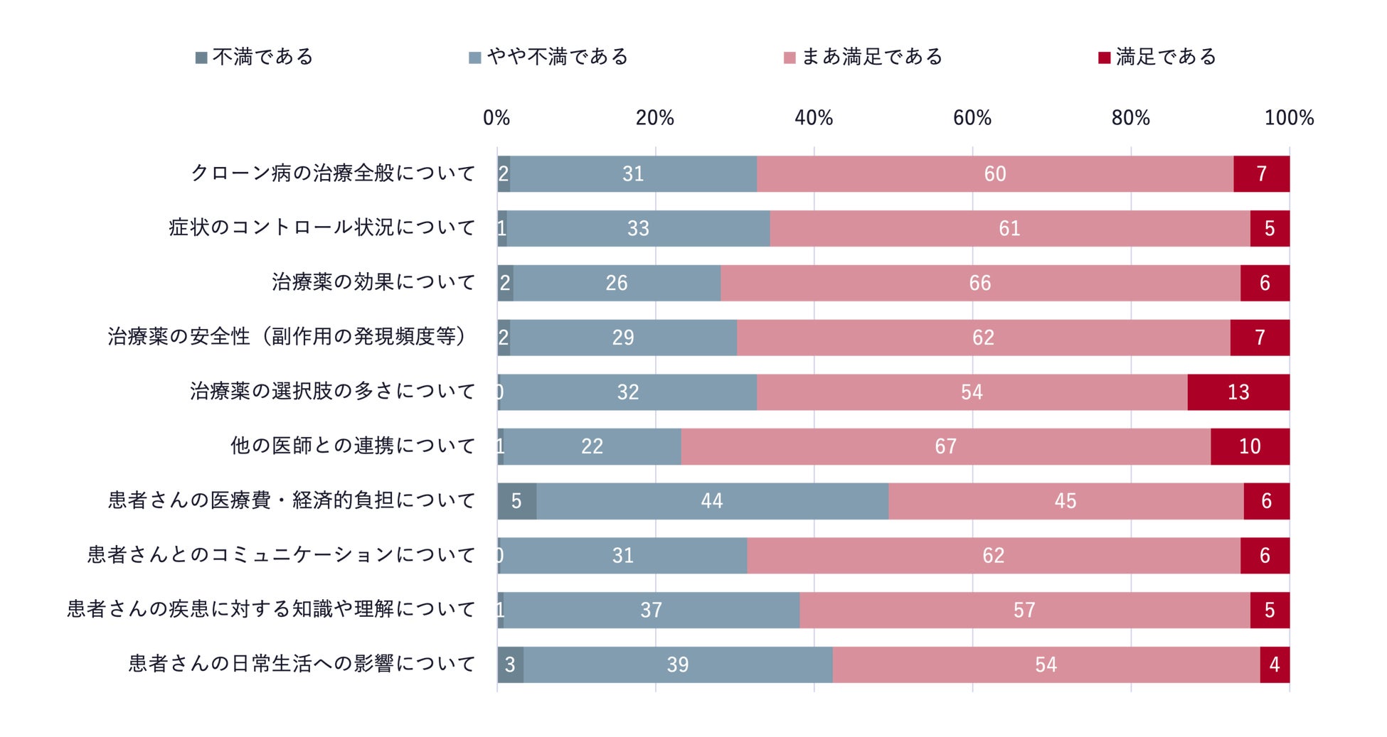 医師調査:クローン病の診療における下記の内容について、先生の満足度を教えてください。