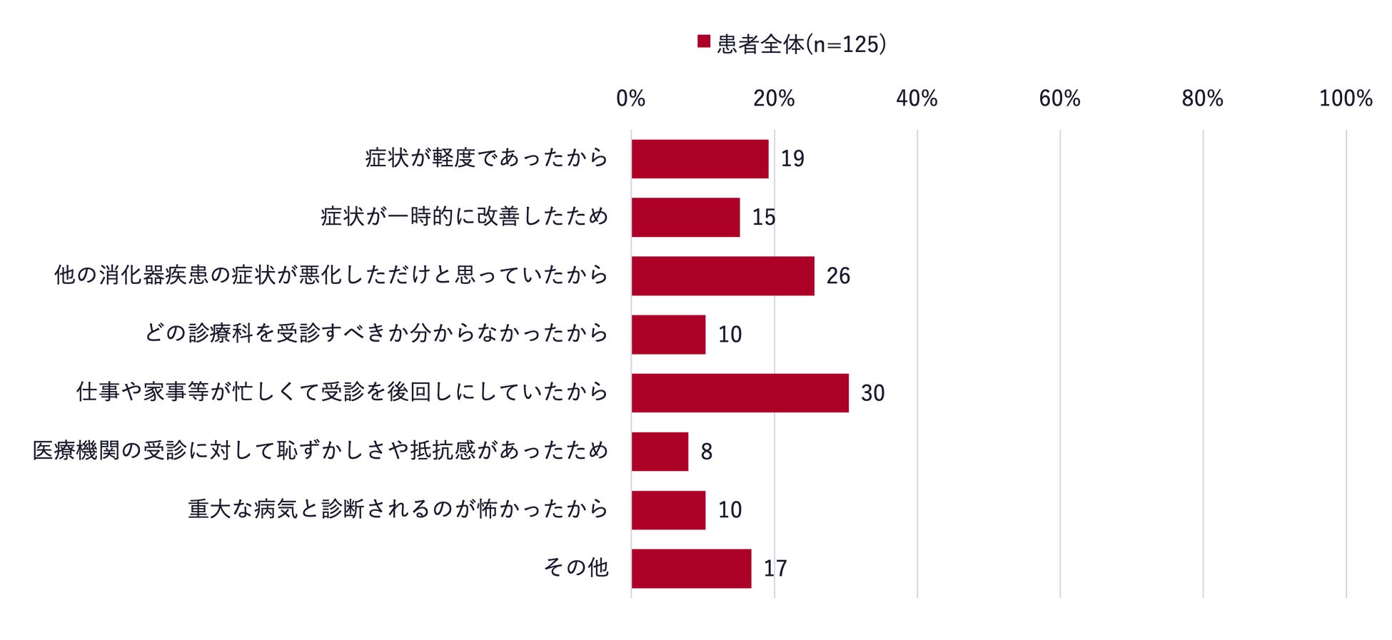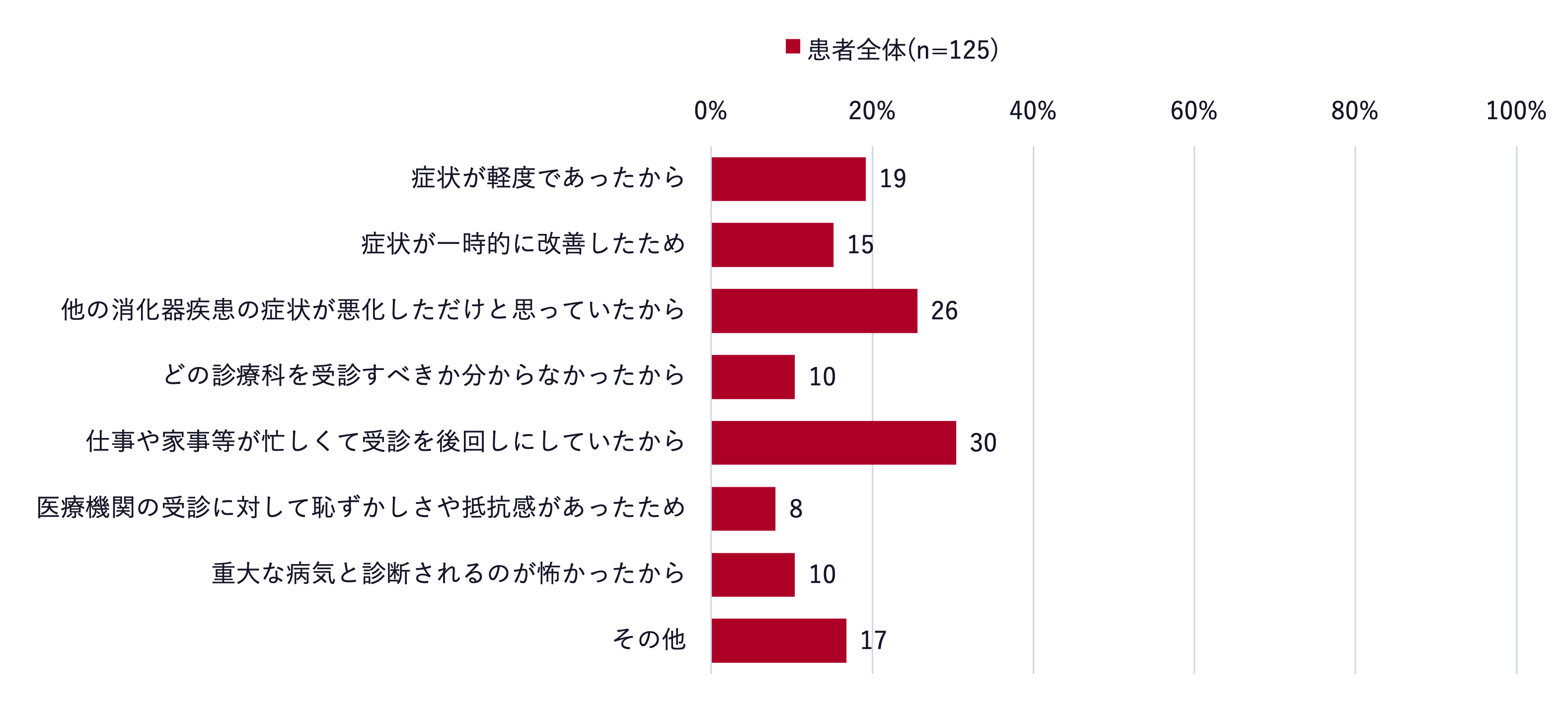 受診が遅れた理由として、「仕事や家事が忙しく受診を後回しにした」(30%)、「他の消化器疾患の悪化だと思った」(26%)が多く、病識の不足から受診が遅れる傾向も見られました。