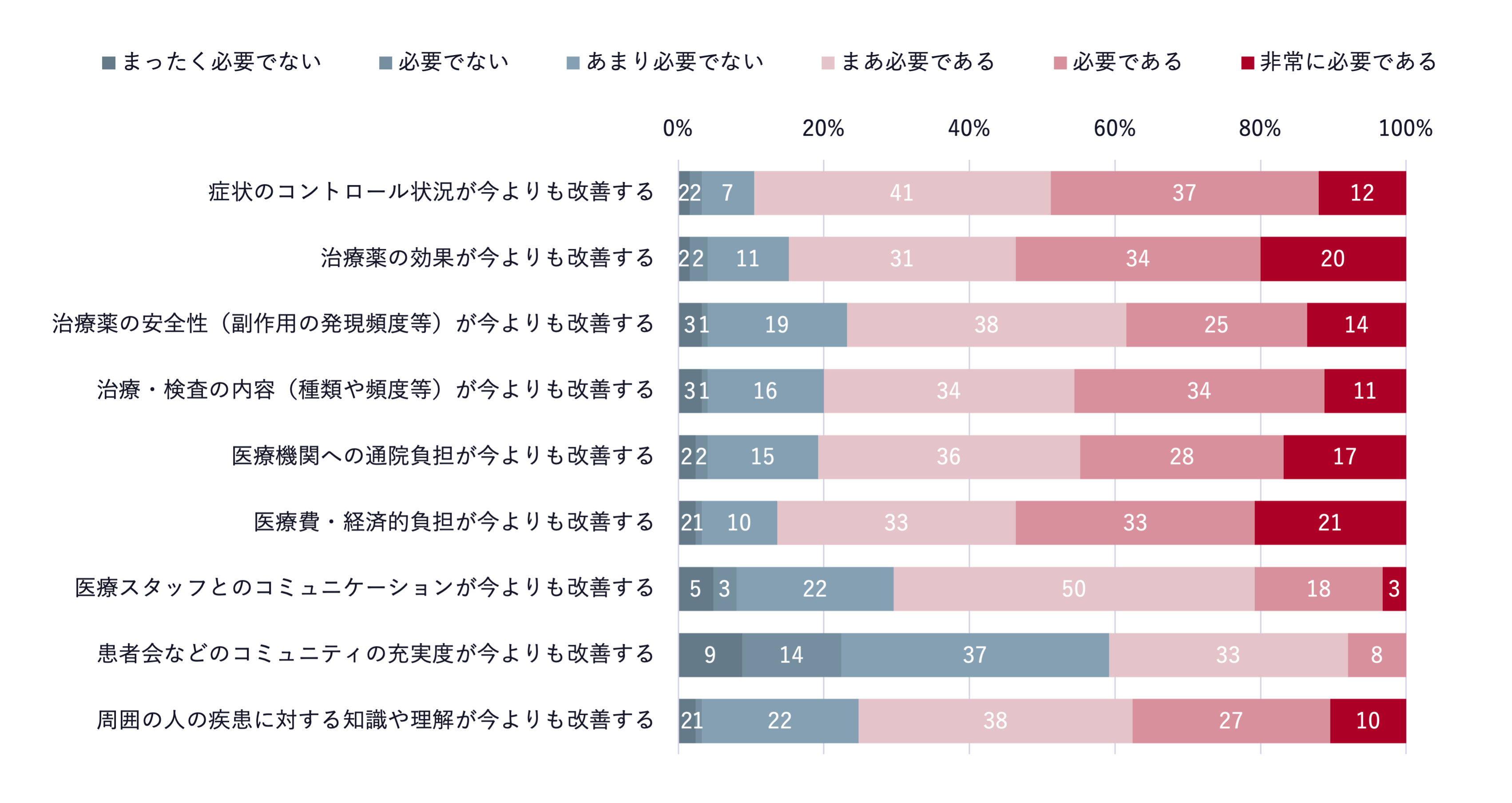 就労を継続するために必要なことの患者調査では、「症状のコントロール状況の改善」(90%)、「医療費・経済的負担の軽減」(86%)、「治療薬の効果改善」(85%)、「周囲の理解向上」(75%)が挙げられました。