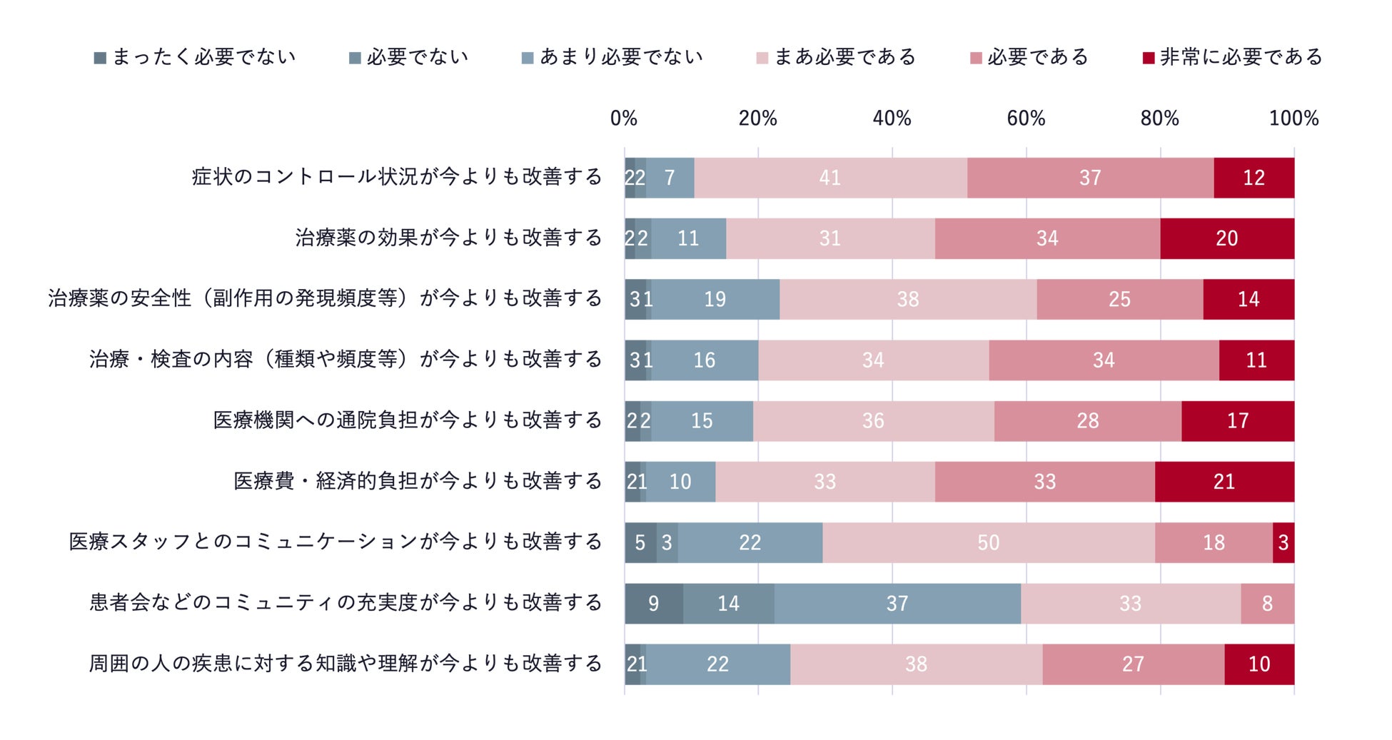 就労環境改善のために必要なことは、「症状のコントロール状況が今よりも改善する」が最多(89.6%)、「医療費・経済的負担の軽減」(86.4%)、「治療薬の効果改善」(84.8%)、が上位を占めた。