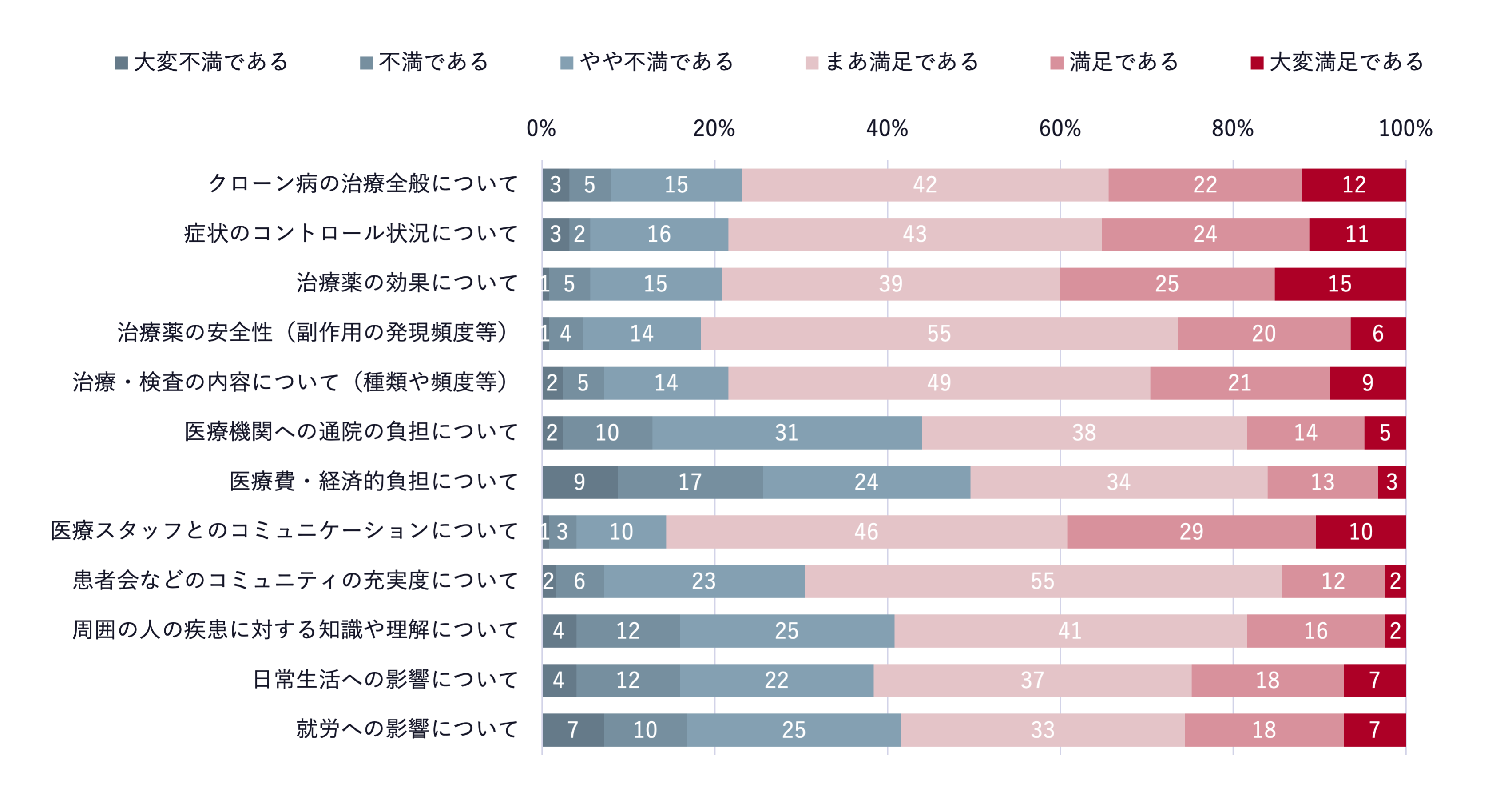 患者調査:クローン病の診療や日常生活への影響についての満足度を教えてください。