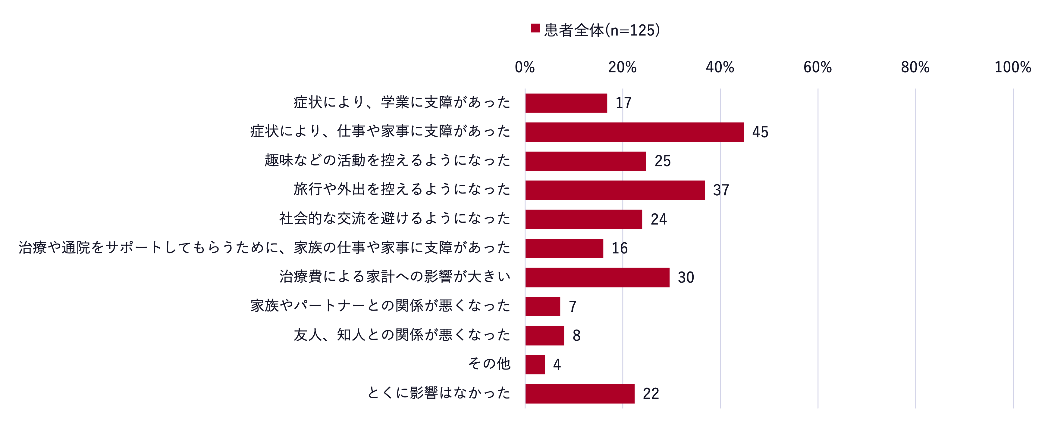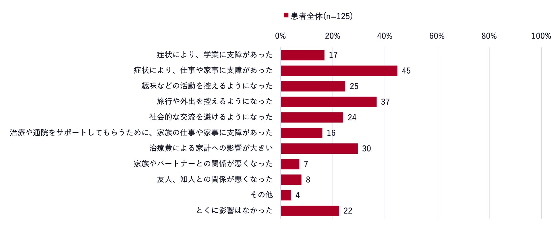 「症状により仕事や家事に支障があった」(44.8%)、「旅行や外出を控えるようになった」(37%)が続き、日常生活のあらゆる領域に影響を及ぼす疾患であることが浮き彫りとなった。また約4人に1人(24.0%)が「社会的な交流を避けるようになった」と回答しており「心理的萎縮」にも影響を及ぼしていることが示唆された。