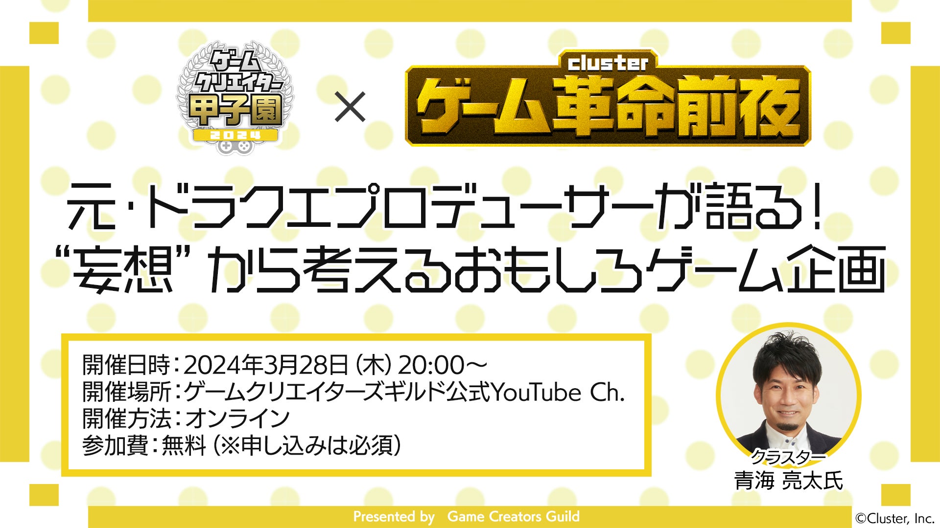 「元・ドラクエプロデューサーが語る!“妄想“から考えるおもしろゲーム企画」は、元『ドラゴンクエスト』シリーズのプロデューサーであり、現クラスターにてプロダクトマネージャーとして携わっている青海亮太氏をゲストに迎えて、ゲーム作りのイロハを学ぶトークイベントです。ゲームを作ってみたい学生からプロやインディーで活躍している方まで、職種問わず、すべてのクリエイターに向けて、ゲーム制作に留まらず企画・アイディアの発想方法や考え方の根本から学べる生配信イベントです。