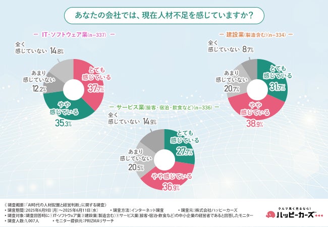 そこで今回、車買取り専門店の株式会社ハッピーカーズ(https://happycars.jp/)は、①IT・ソフトウェア業②建設業(製造含む)③サービス業(接客・宿泊・飲食など)の中小企業の経営者を対象に、「AI時代の人材配置と経営判断」に関する調査を実施しました。
