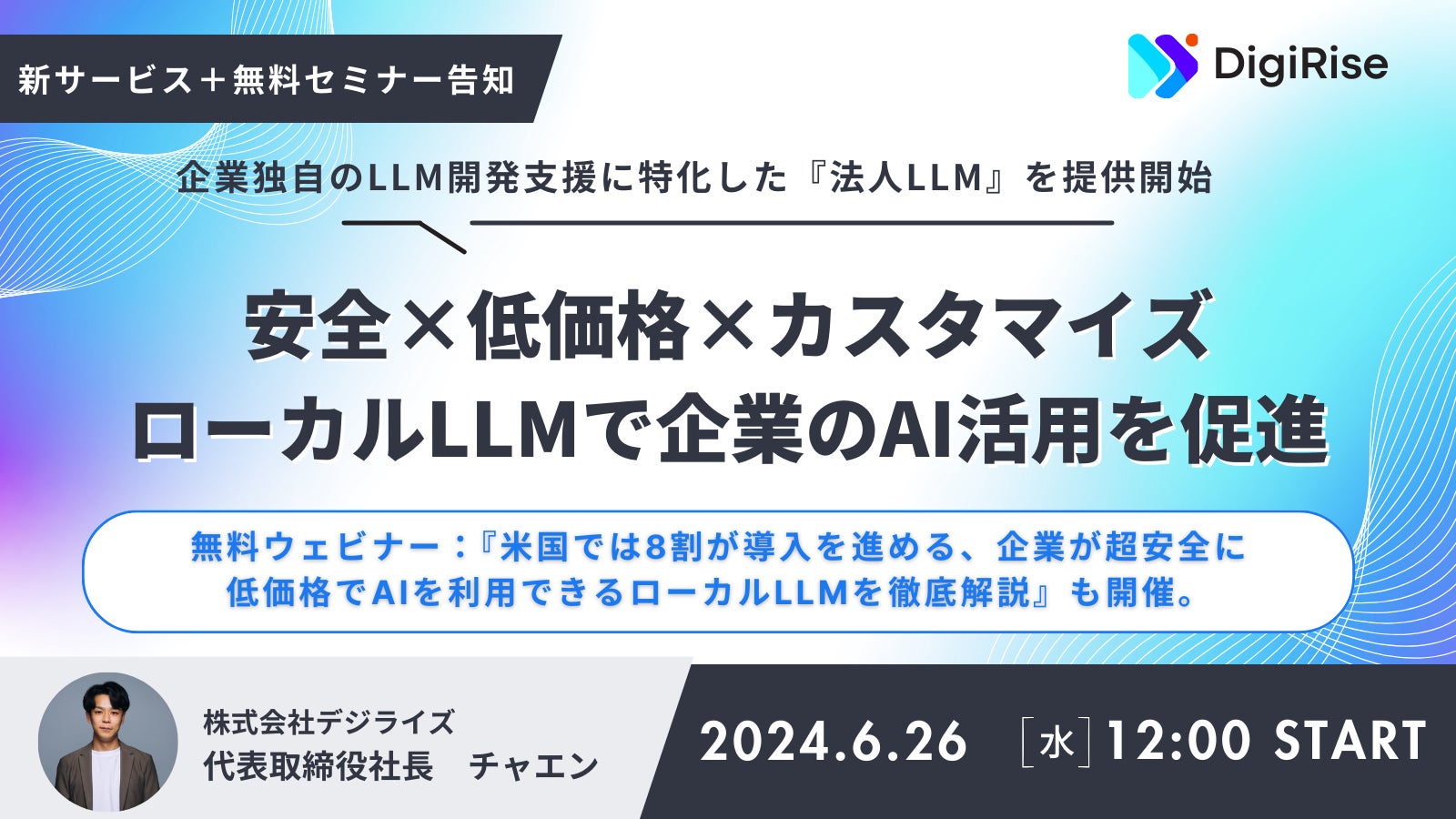 企業の独自LLM開発支援に特化した『法人LLM』を提供開始。安全・低価格・カスタマイズ可能の特徴を活かして、企業の安全で効果的なAI活用を支援:6月26日(水)12:00〜無料セミナーも開催。