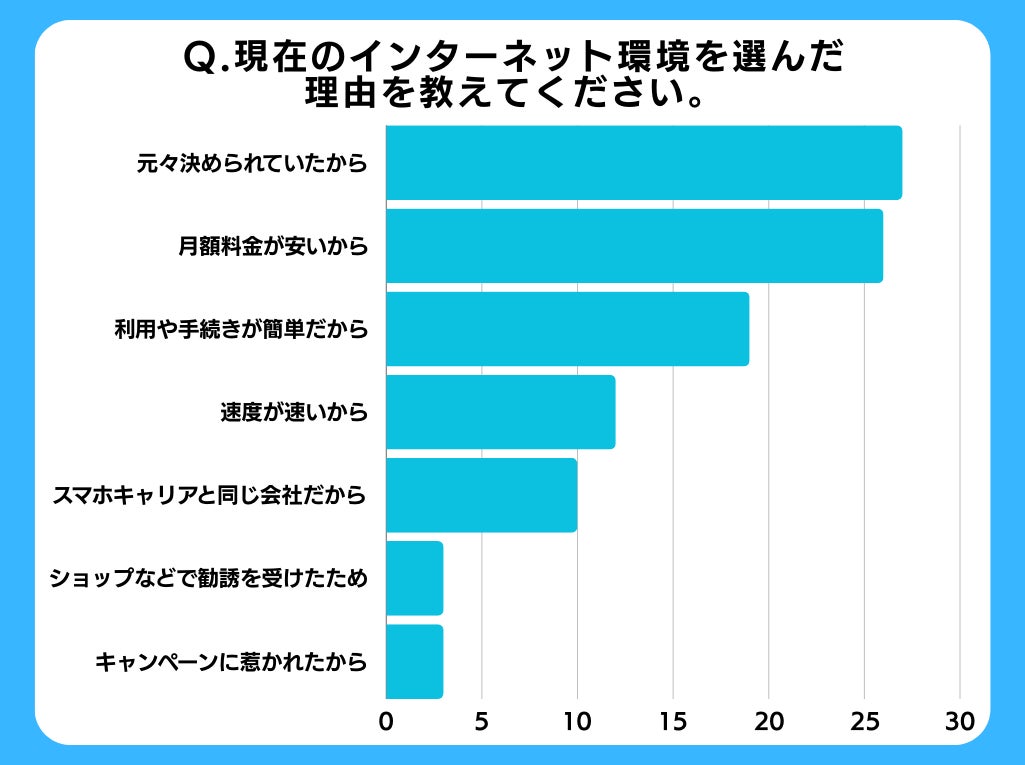 現在利用しているインターネット環境を選んだ理由については、「元々決められていたから」と回答した人が多く、100人中27名でした。また、次点で多かったのは「月額料金が安いから」と回答した26名と、「利用や手続きが簡単だから」と回答した19名でした。