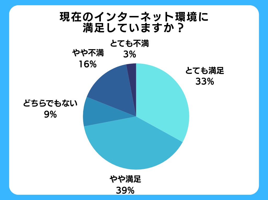 ・現在のインターネット環境に満足しているかについては「とても満足」「やや満足」と答えた人が合計して全体の72%を占めました。