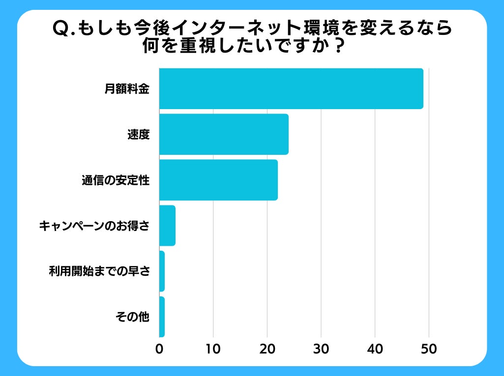 ・インターネット環境を変えるとしたら何を重視したいかについては、「月額料金」と答えた人が100人中49名と最も多く、次いで「速度」が24名、「通信の安定性」が22名という結果でした。