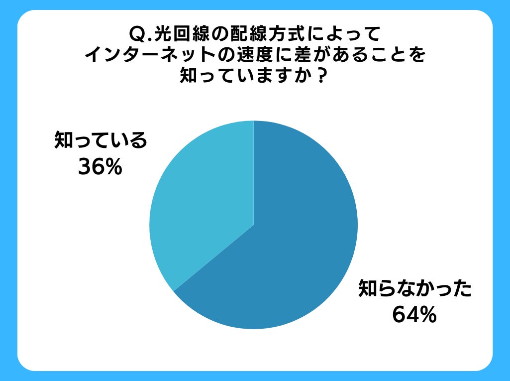さらに、現在のインターネット環境が光回線と回答した人に対し、光回線の配線方式によって回線速度に差があることを知っているか調査したところ、64%が「知らなかった」、36%が「知っていた」と回答しました。