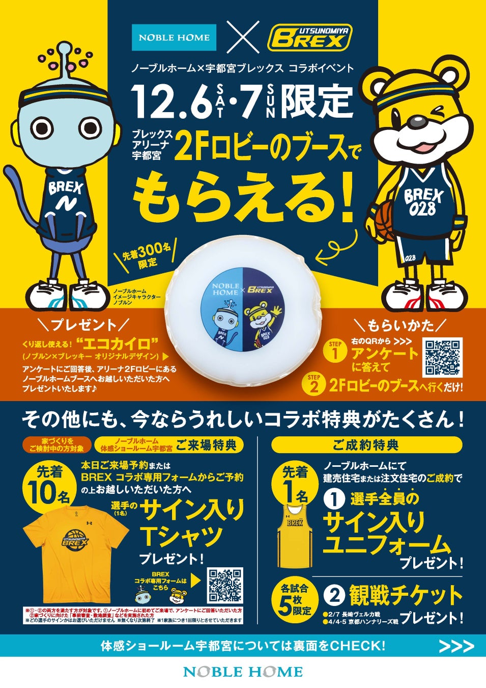 ブースでは、配布チラシのアンケートにご回答を頂いた皆様に、ノーブルホームのイメージキャラクター【ノブルン】と、宇都宮ブレックスのイメージキャラクター【ブレッキー】のコラボエコカイロがプレゼントされ、ファンの皆さまにはとても喜んでいただけました。