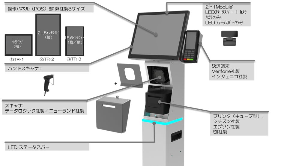 Varie(バリエ)シリーズは当社製のPOS端末『iTRシリーズ』を核とした多目的セルフターミナルです。周辺機器(スキャナ、レシートプリンタ、決済端末等)とスタンドオプション(カゴ置き台等)を組み合わせることによりエンドユーザーの運用目的に最適な機器構成を実現できます。