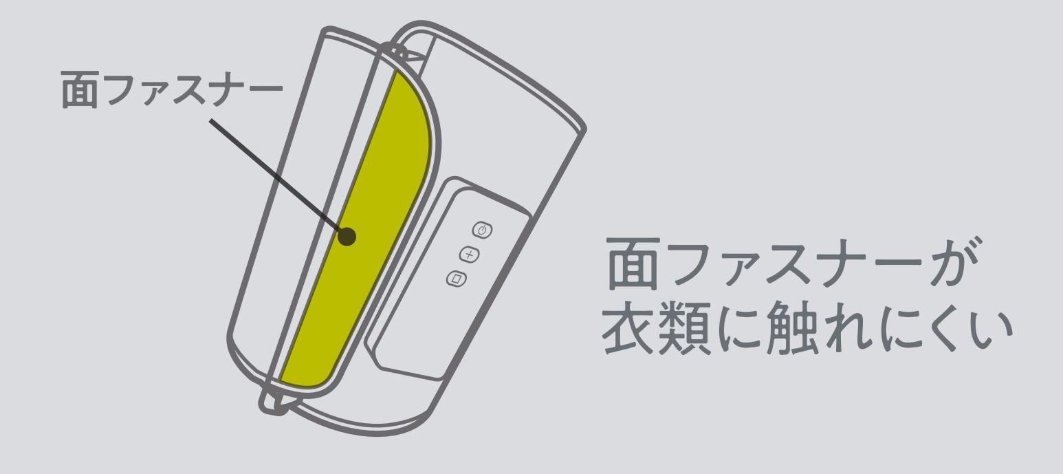 また、ベルトをフレームに通して締める方式なので、装着の際に、面ファスナーが衣類に触れにくい仕様です。