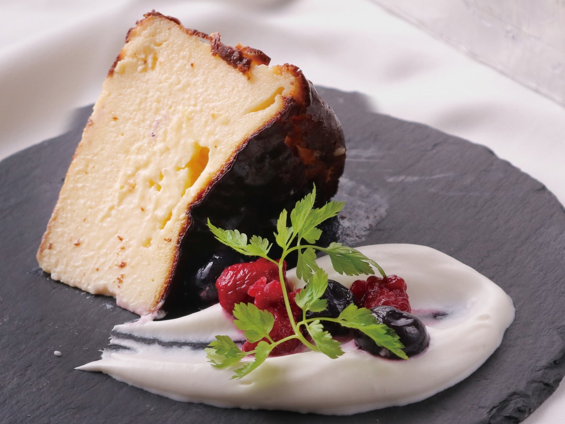 なめらかでとろける口どけの自家製チーズケーキ。焦がされた焼きめが香ばしく濃厚ながらも甘さ控えめな人気のスイーツ。