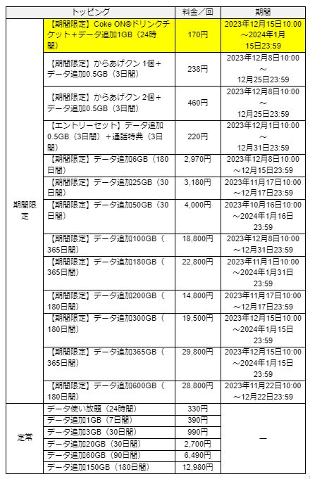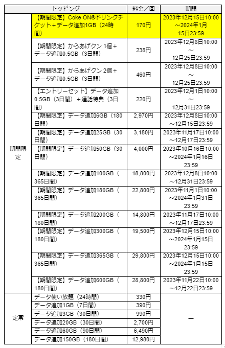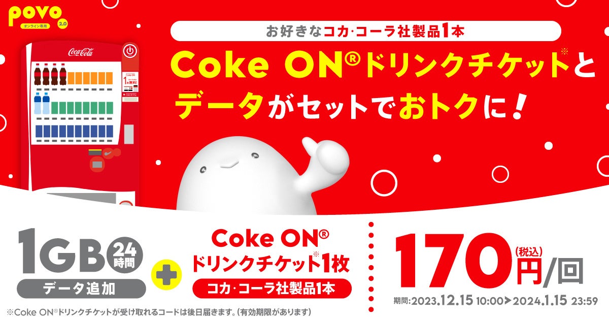 【期間限定】Coke ON®ドリンクチケット1枚 +データ追加1GB(24時間) | 170円 | 2023年12月15日 10:00 ~ 2024年1月15日 23:59 |